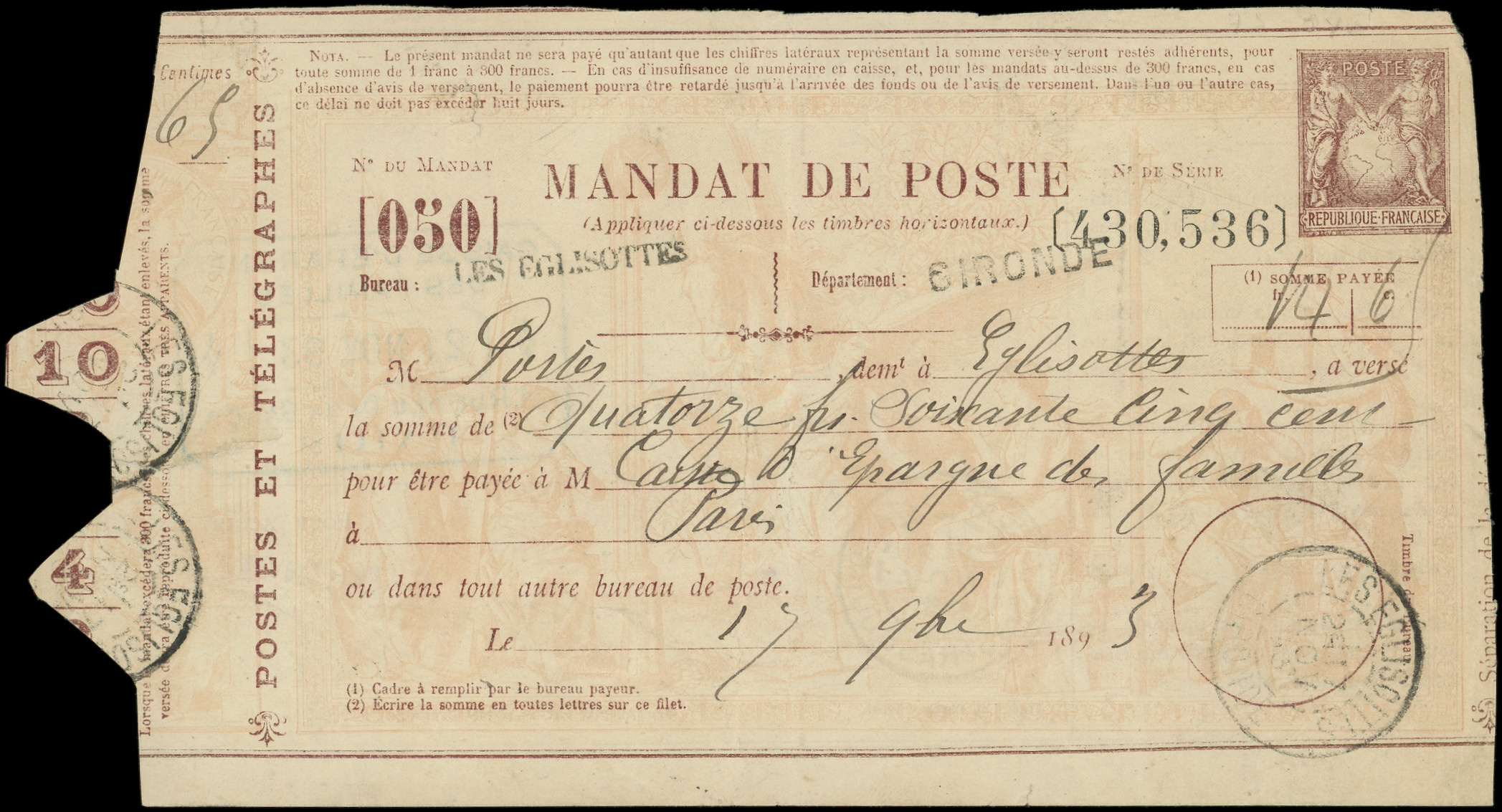 avec Globe, Mandat n°R9 Mill. 189, càd LES EGUSOTTES 17/11/95, au verso càd Paris 21/11, TB (Image) (Image2)