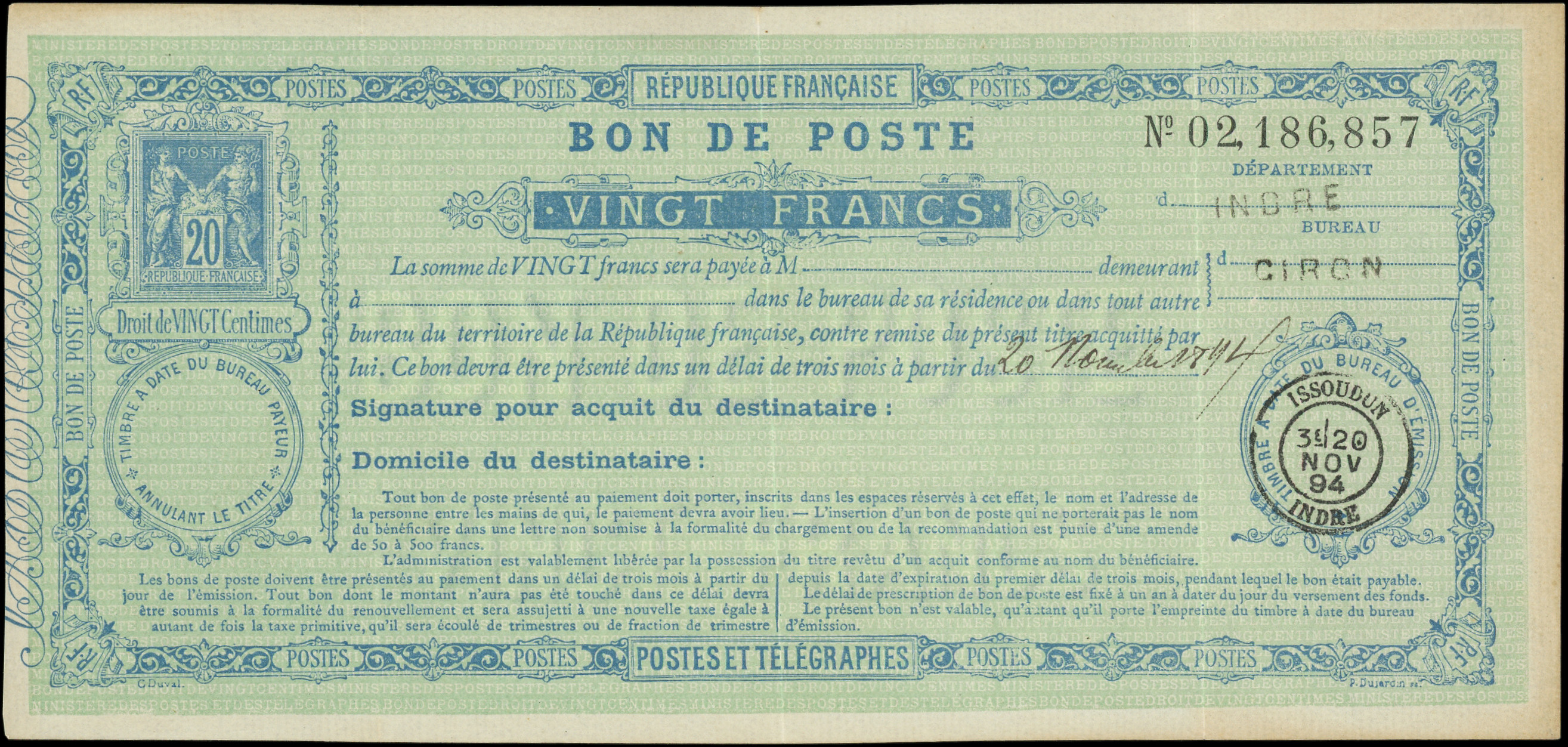 Bon de Poste n°K2, 20f. vert, Postes et Télégraphes, càd ISSOUDUN 20/11/94, TB (Image)