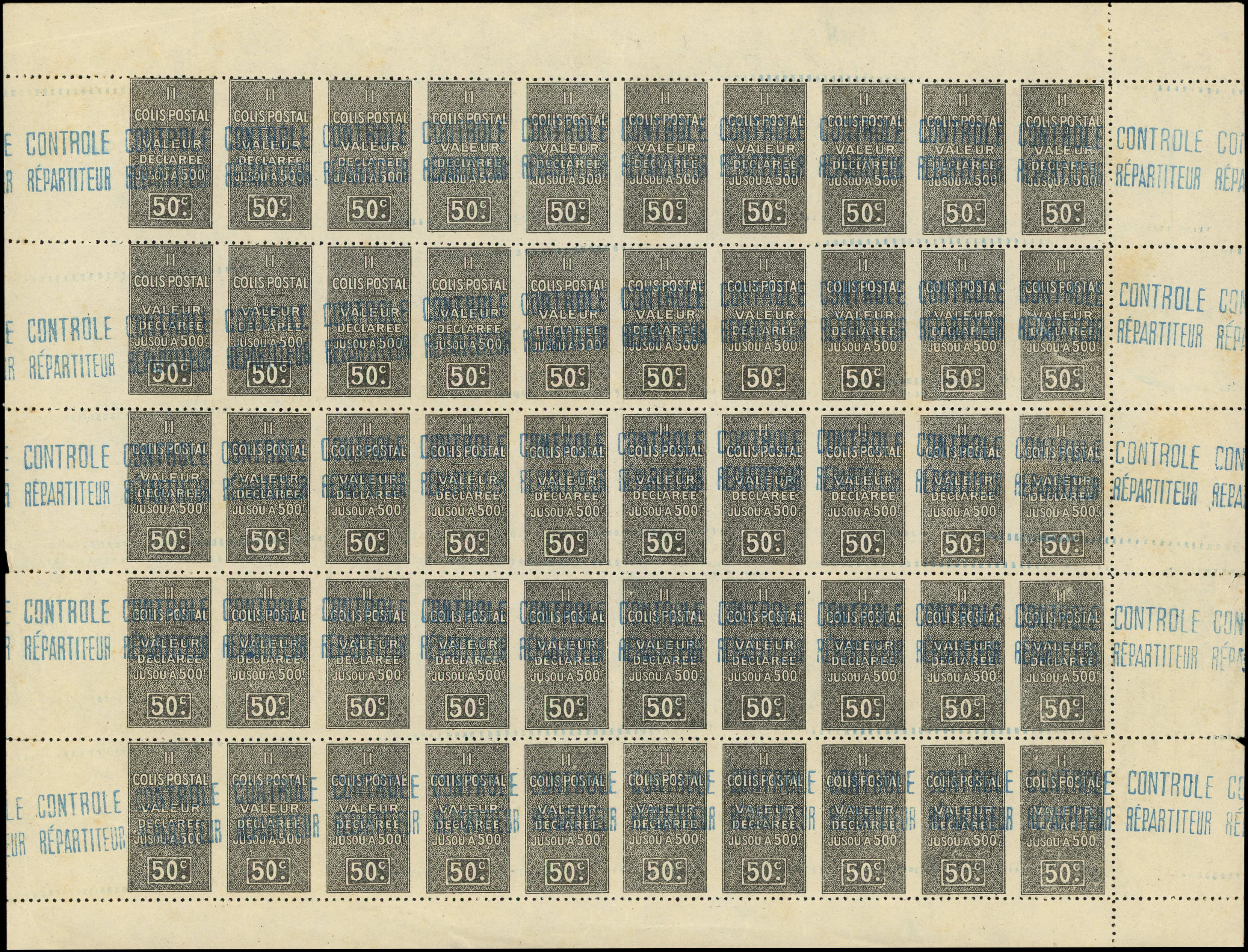 : 50c., FEUILLE de 50 sans dentelure verticale, rouss., pli sur 3 ex., B/TB (Image)