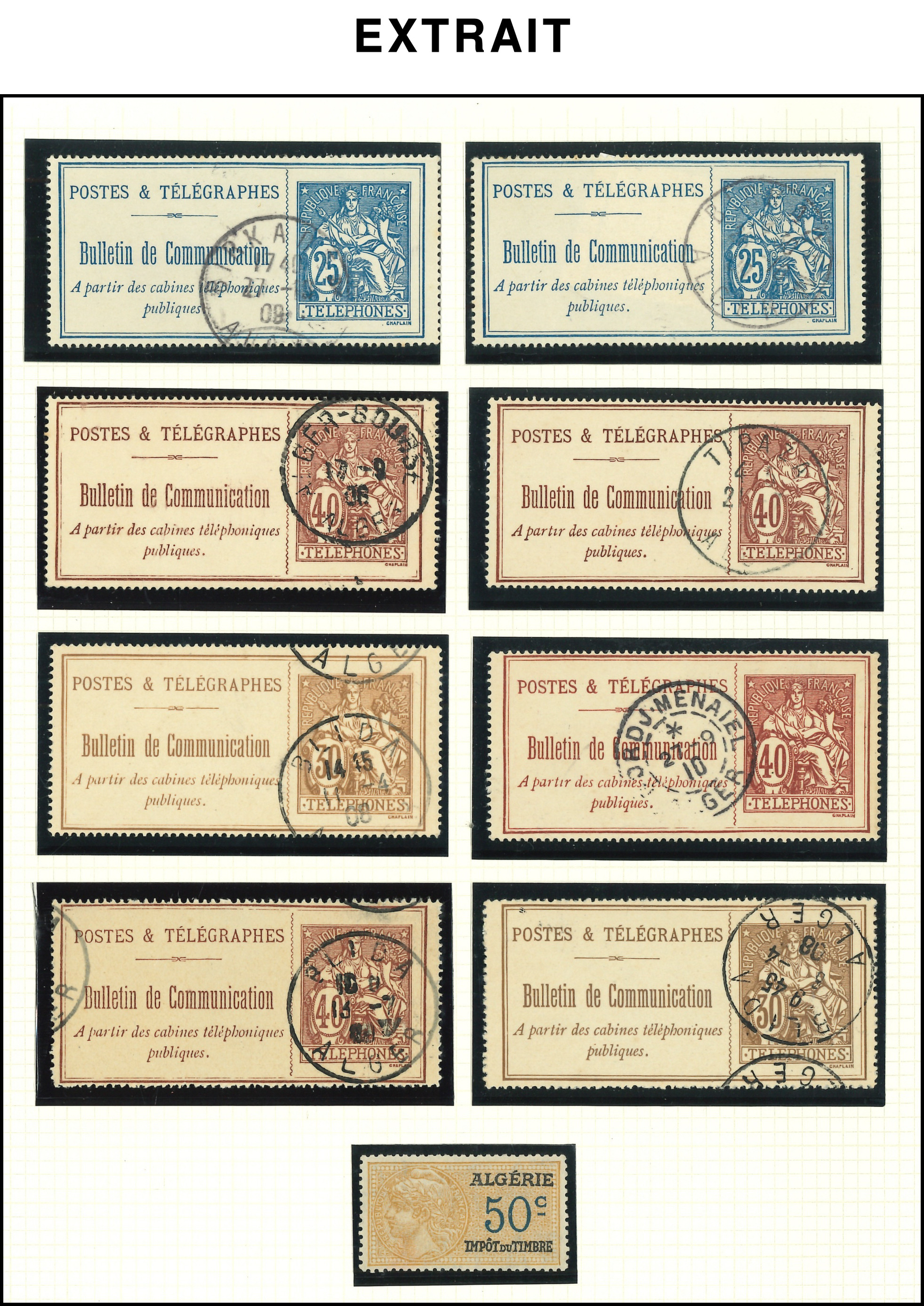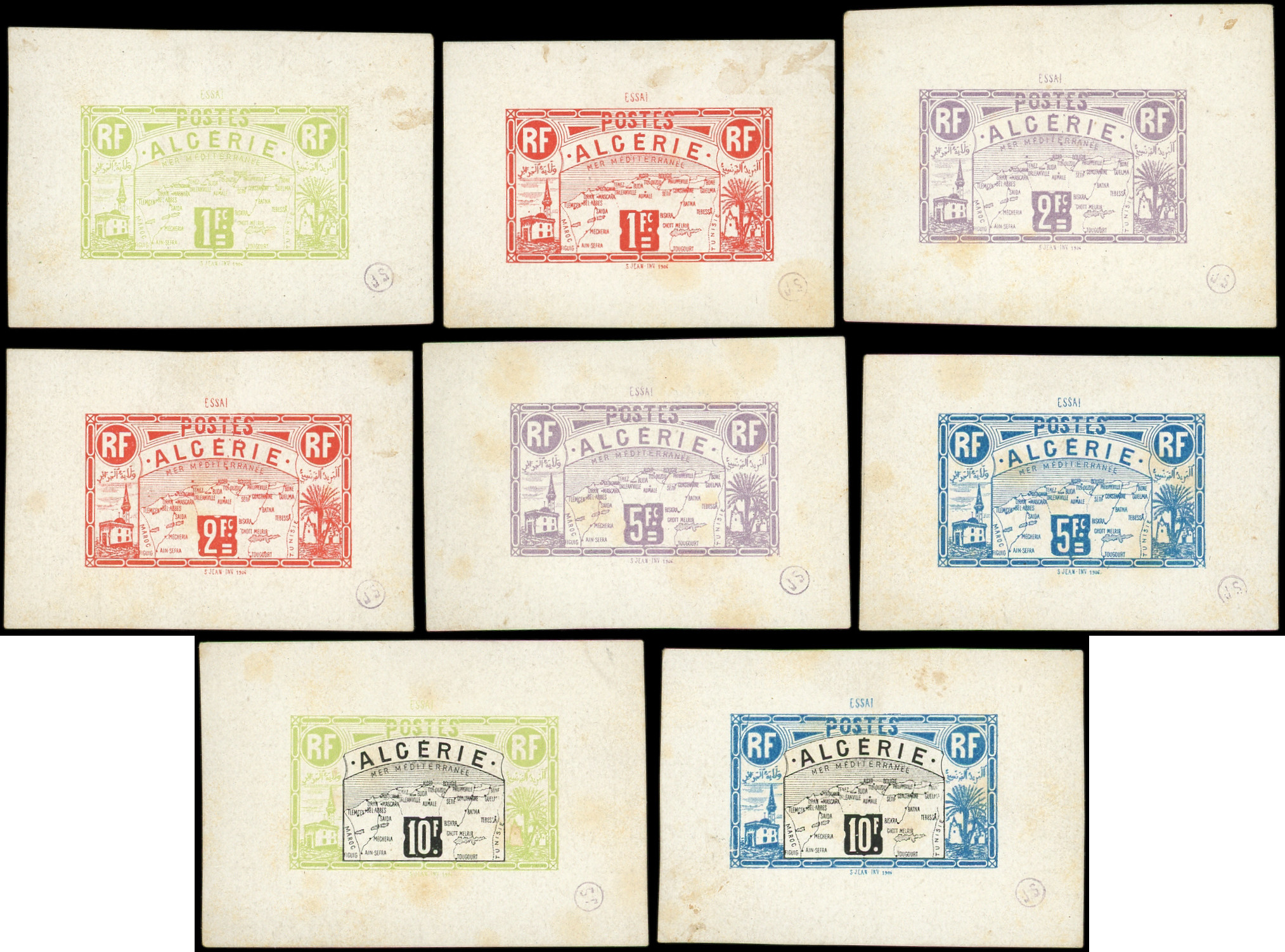 de couleurs différentes, faciales 1f., 2f., 5f. et 10f. d'un timbre NON EMIS, datées 1906, qqs rousseurs mais RR (Image)