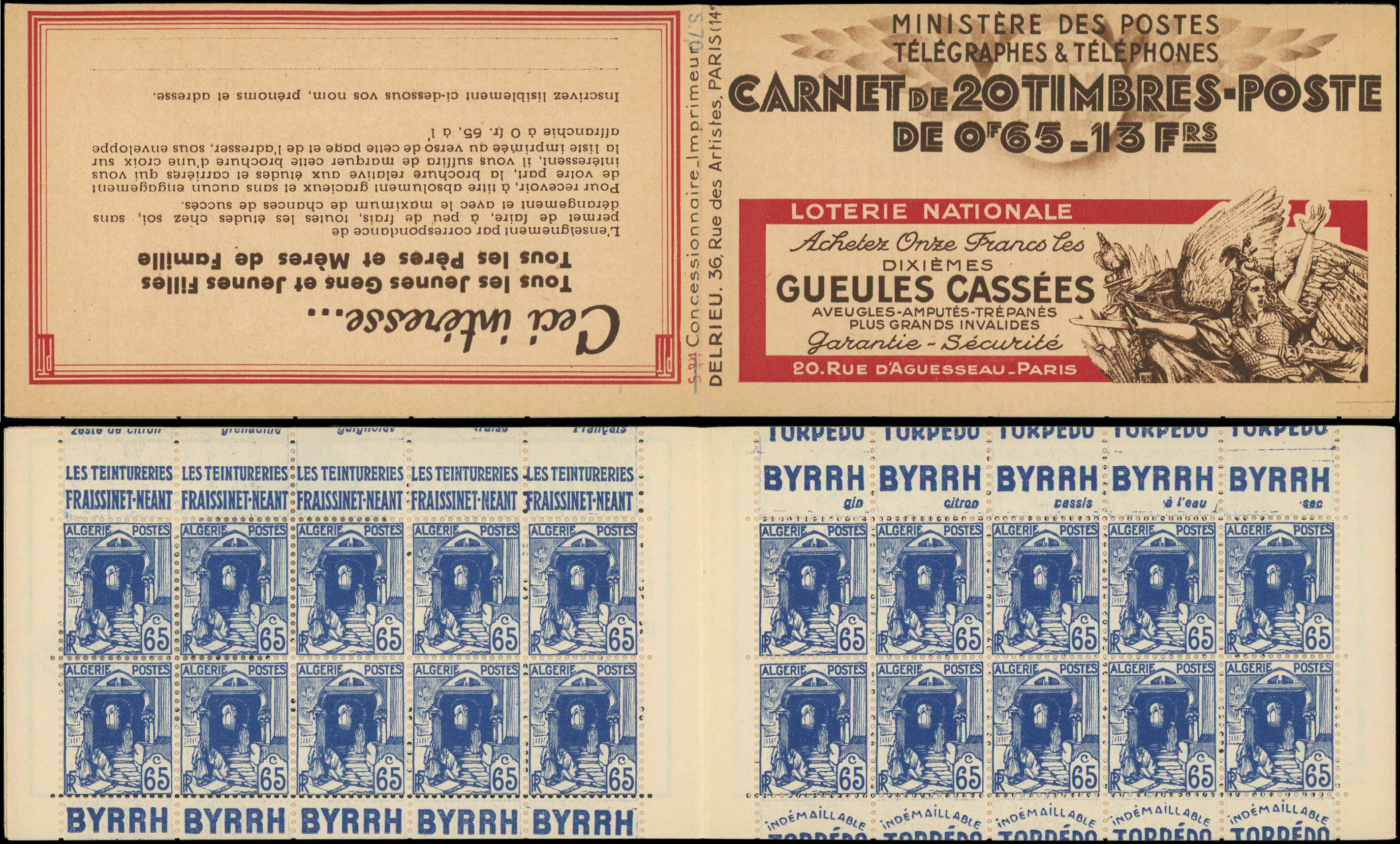 65c. bleu, S. 34, GUEULES CASSEES sans sigle P.T.T., TB (Image)