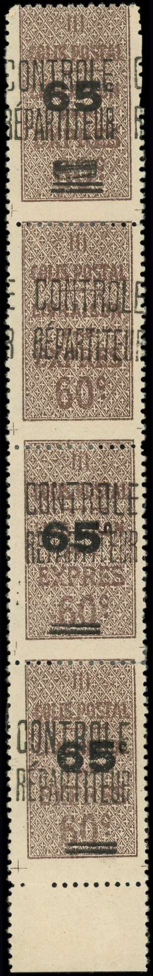 : 65c. sur 60c. brun, BANDE de 4 bdf, 1 ex. SANS surcharge, TB (Image)