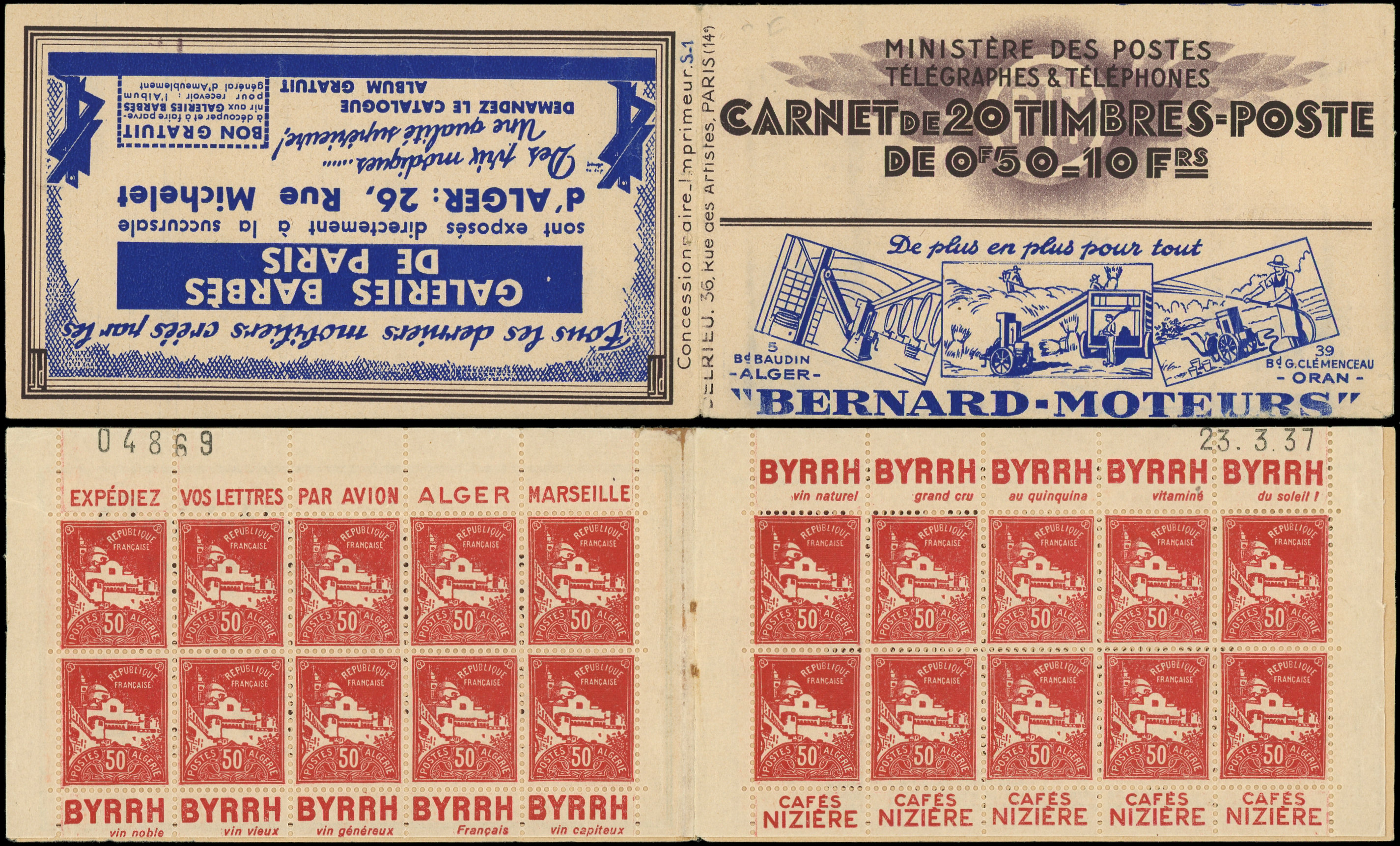 50c. rouge, S. 1, BERNARD-MOTEURS/GALERIES BARBES, n°04869 daté 23/3/37, TB (Image)