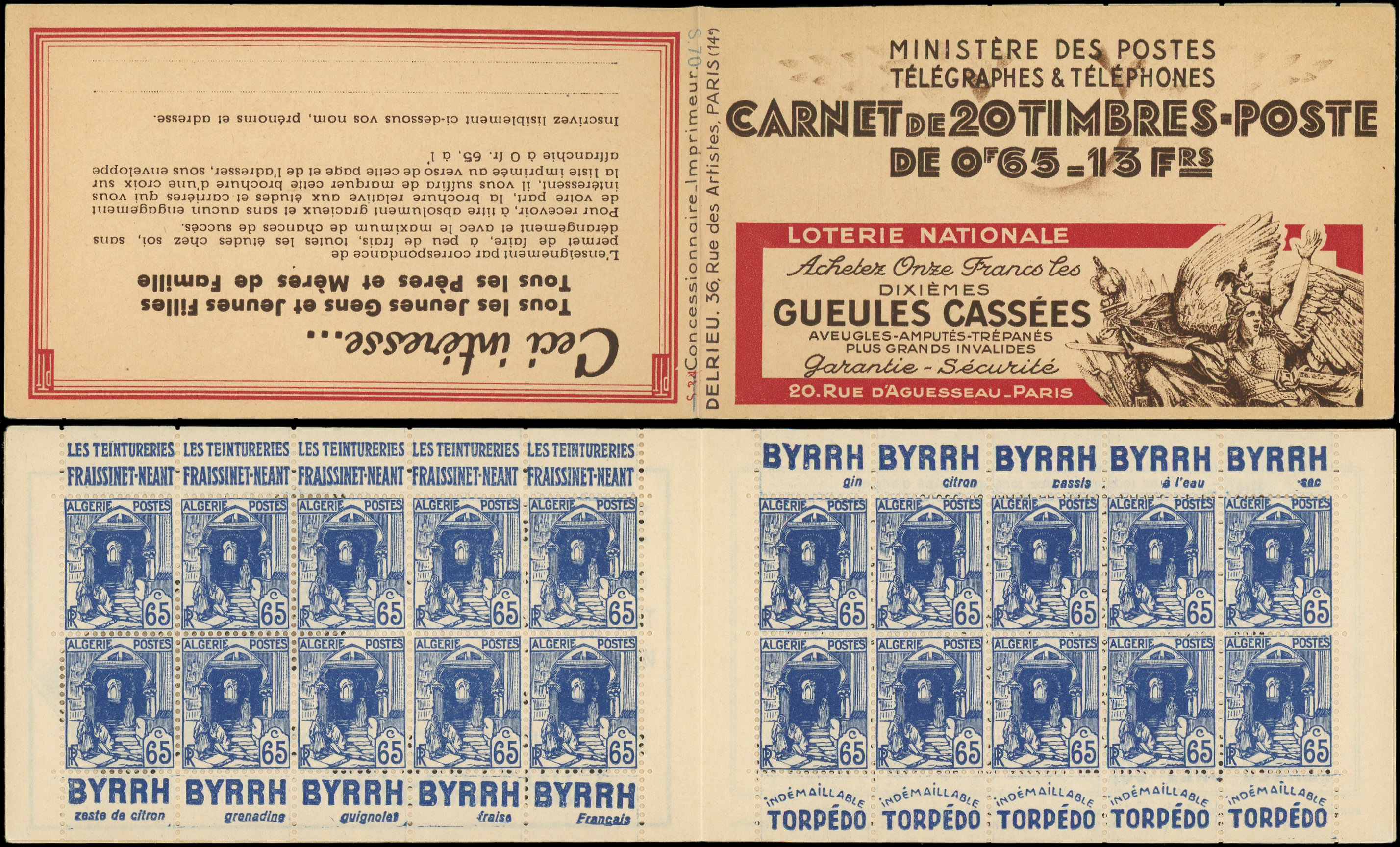 65c. bleu, GUEULES CASSEES, amorce de double pub sur 10 ex., TB (Image)