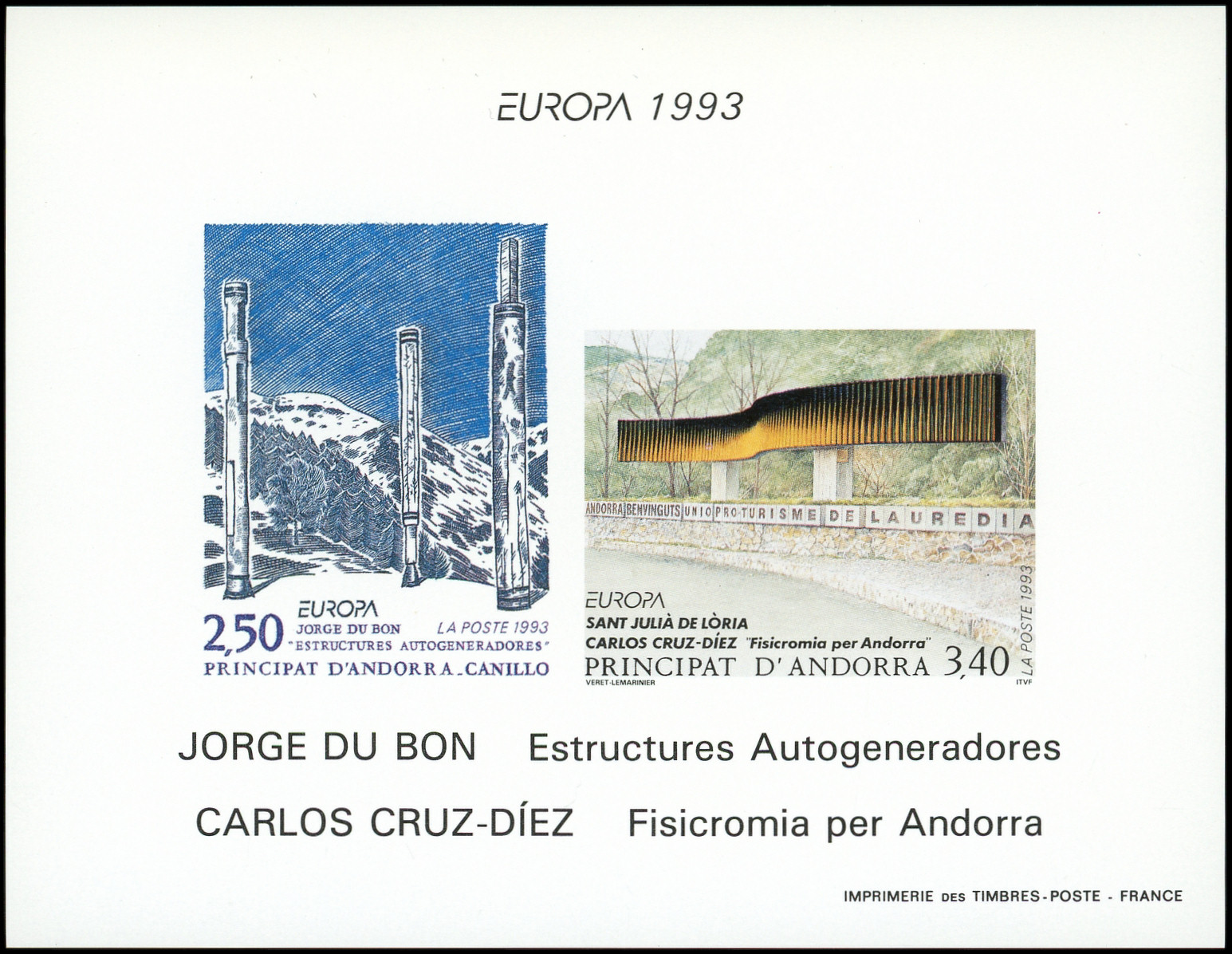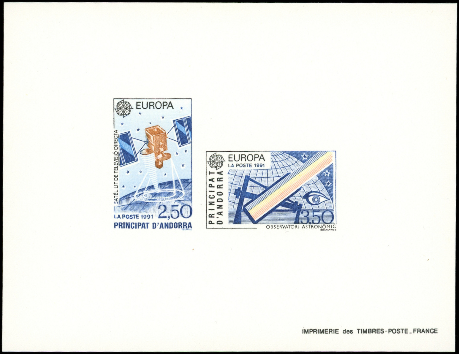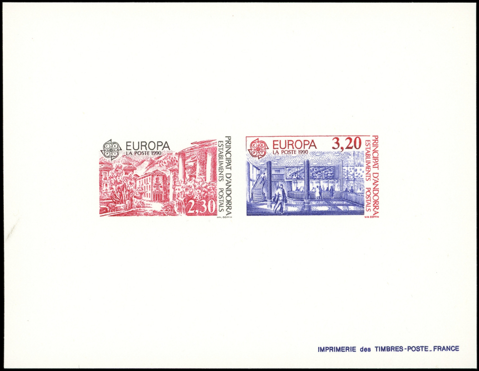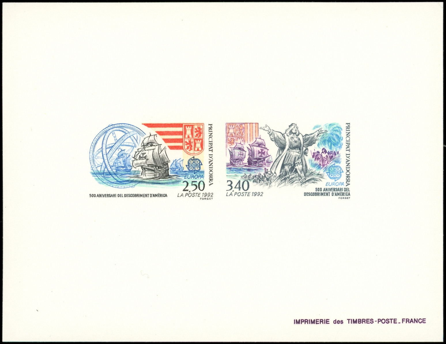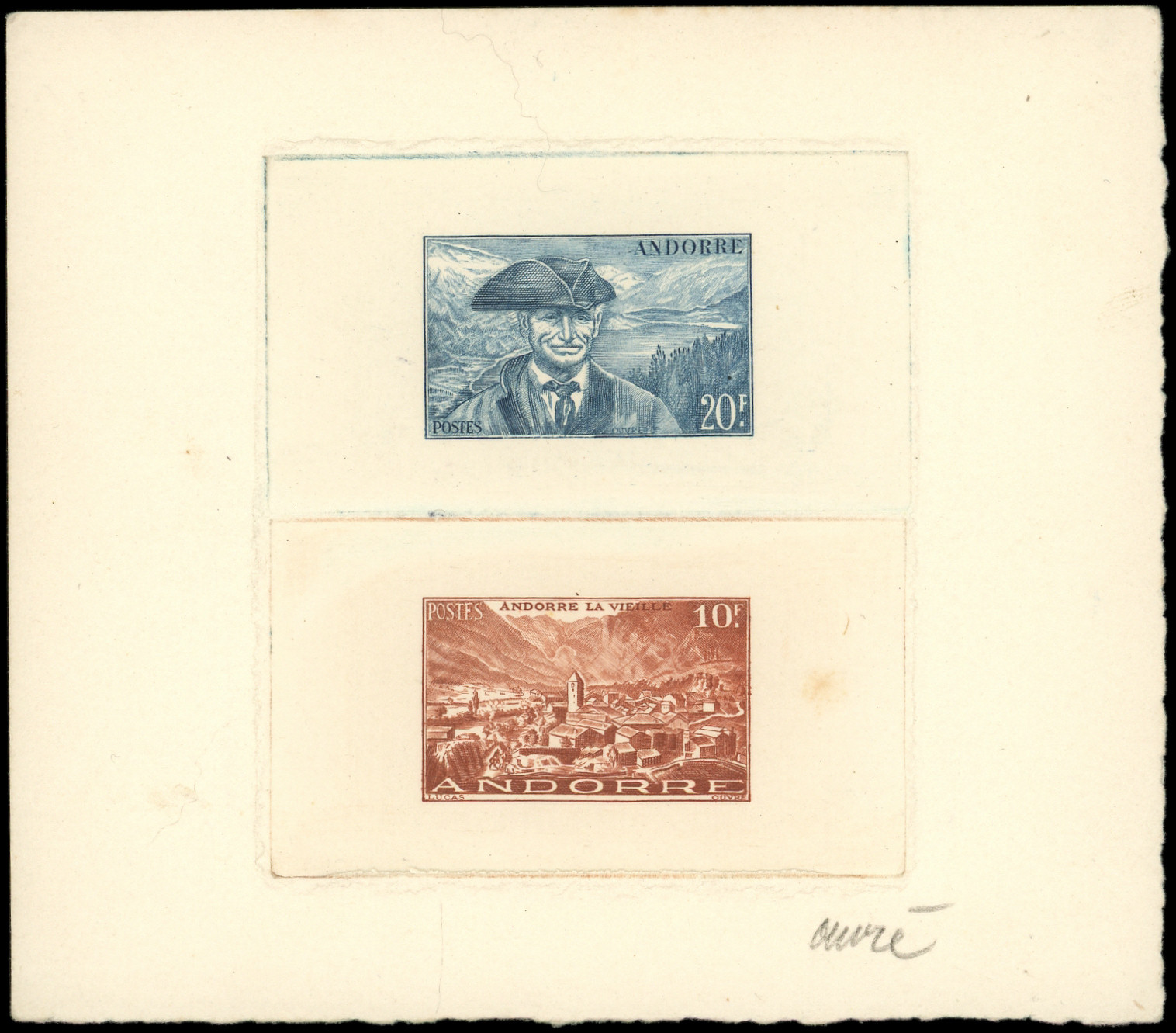et 20f. de 1944-46, Epreuve d'artiste collective en brun-rouge et bleu signée Ouvré, RR et TB (Image)