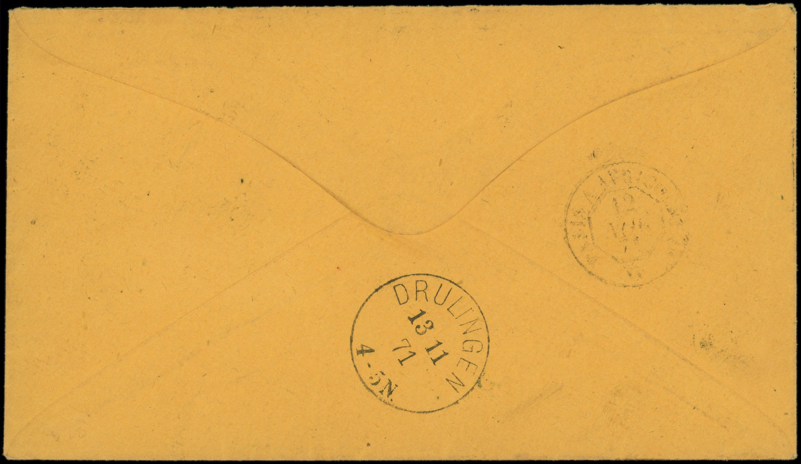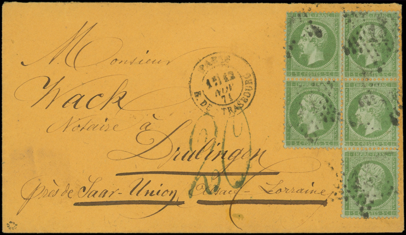 BANDE de 3 et PAIRE, obl. Etoile 14 s. Env., càd R. de Strasbourg 12/11/71, TAXE ALLEMANDE 20 au tampon bleu et arr. DRULINGEN ALSACE LORRAINE, TB (Image) (Image2)