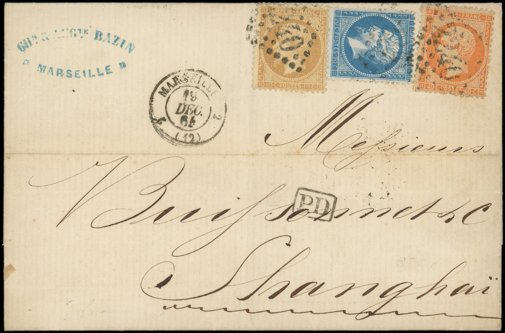 10c., 20c. et 40c. obl. GC 2240 s. LSC, càd 2 MARSEILLE 2 18/12/64, arr. SHANGHAI, TRICOLORE TB (Image) (Image2)