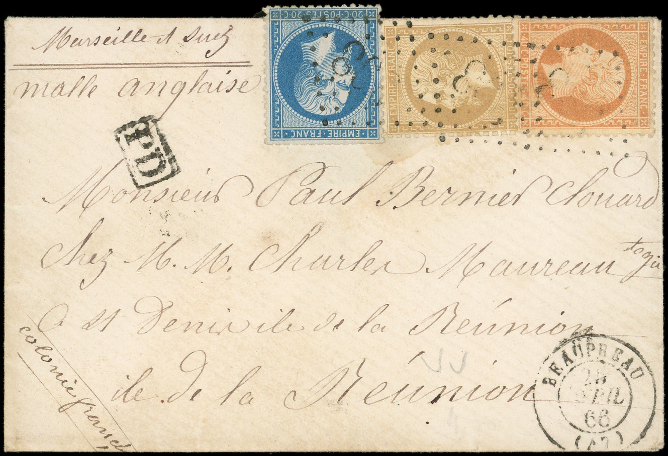 10c., 20c. et 40c. obl. GC 398 s. Env., càd T15 BEAUPREAU 25/4/66, jolie TRICOLORE pour la REUNION, TTB (Image)