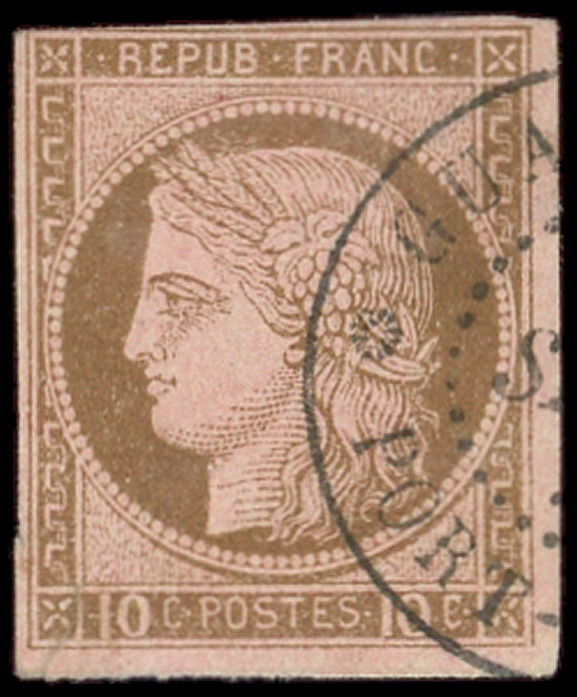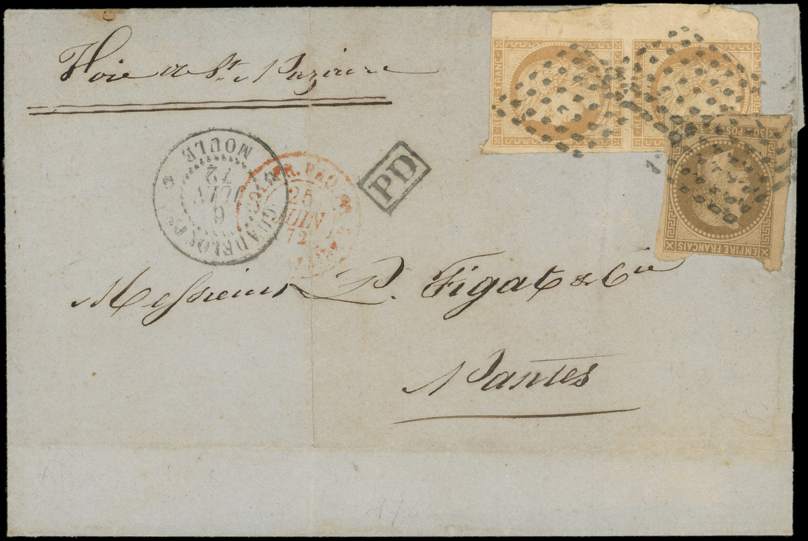 et N°11 10c. bistre PAIRE bdf, obl. Los. 49 pts s. LAC, càd MOULE 6/6/72, voie Française pour NANTES, 2 t. courts, mais bureau rare (Image)