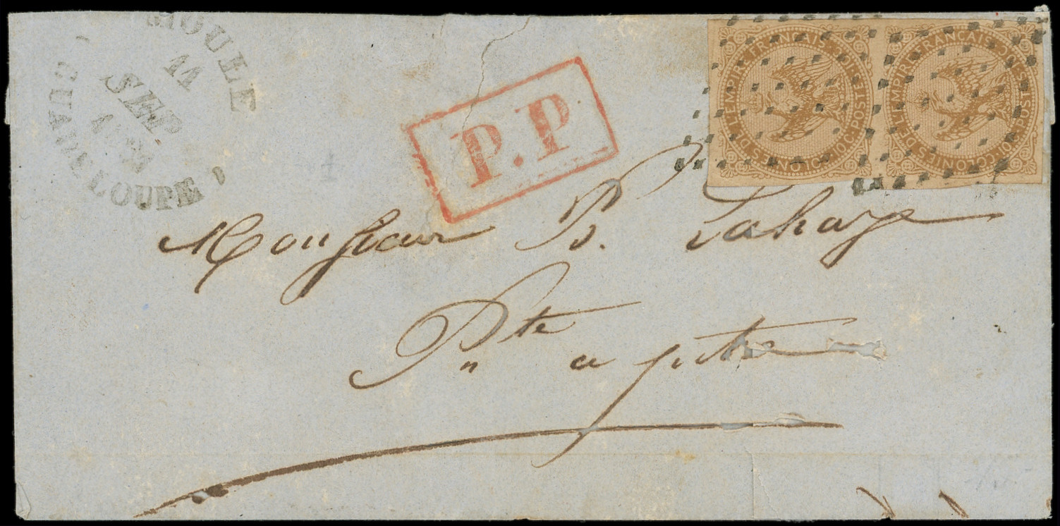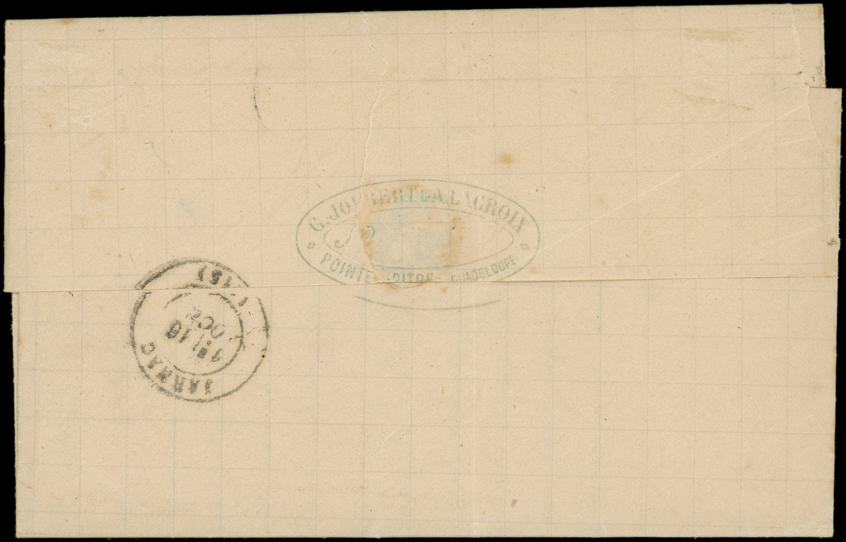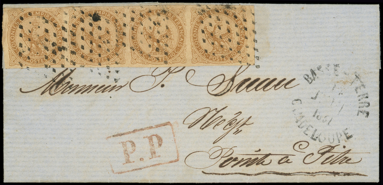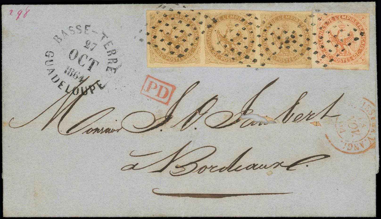10c. BANDE de 3 et 40c. obl. Losange de 49 points s. LAC, grand càd BASSE-TERRE 27/10/64, arr. Bordeaux 17/11, pièce en photo dans Yvert 2017, Superbe (Image) (Image2)