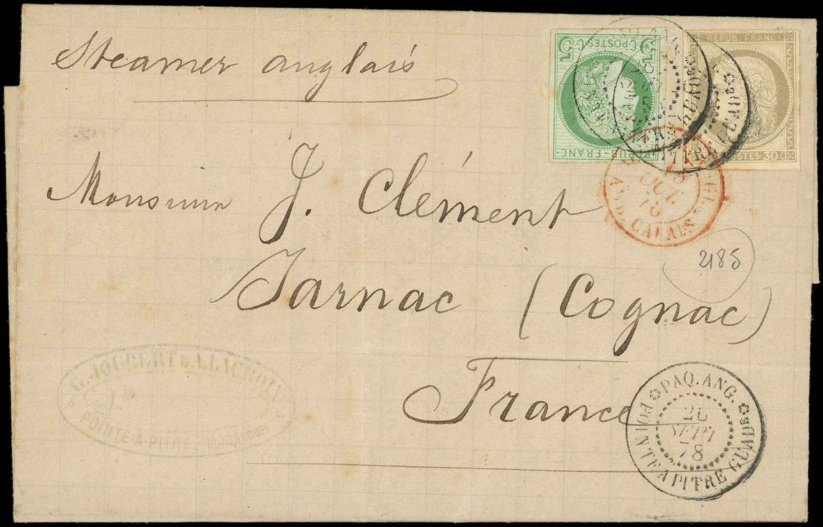 sur azuré et N°20 30c. brun obl. càd PAQ. ANG./POINTE A PITRE GUADe 26/9/78 et càd rouge COL. FR. ANGL/AMB. CALAIS 15/10 s. LAC, TB (Image) (Image2)
