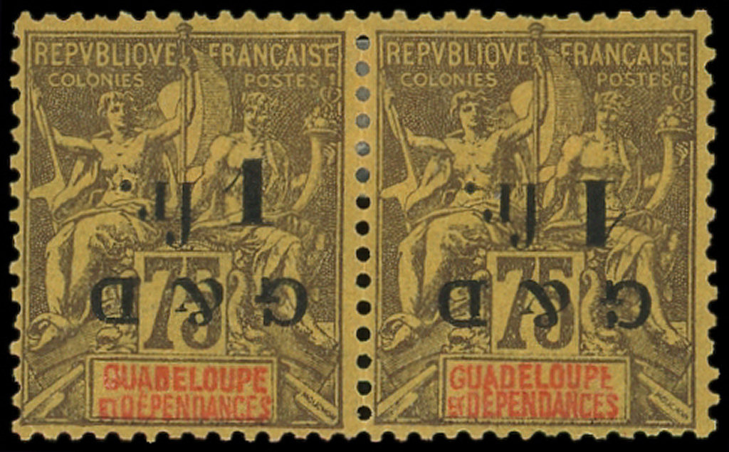 75c. violet sur jaune, surch. RENVERSEE Types d et q, PAIRE, 1 ex. chiffre 1 à l'endroit, TB (Image)