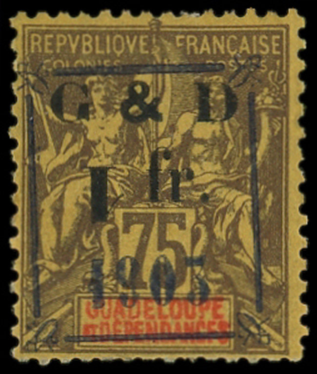 75c. violet sur jaune, surch. bleue Types t, a et q, chiffre 1 RENVERSE et G et D en dessous, TB (Image)