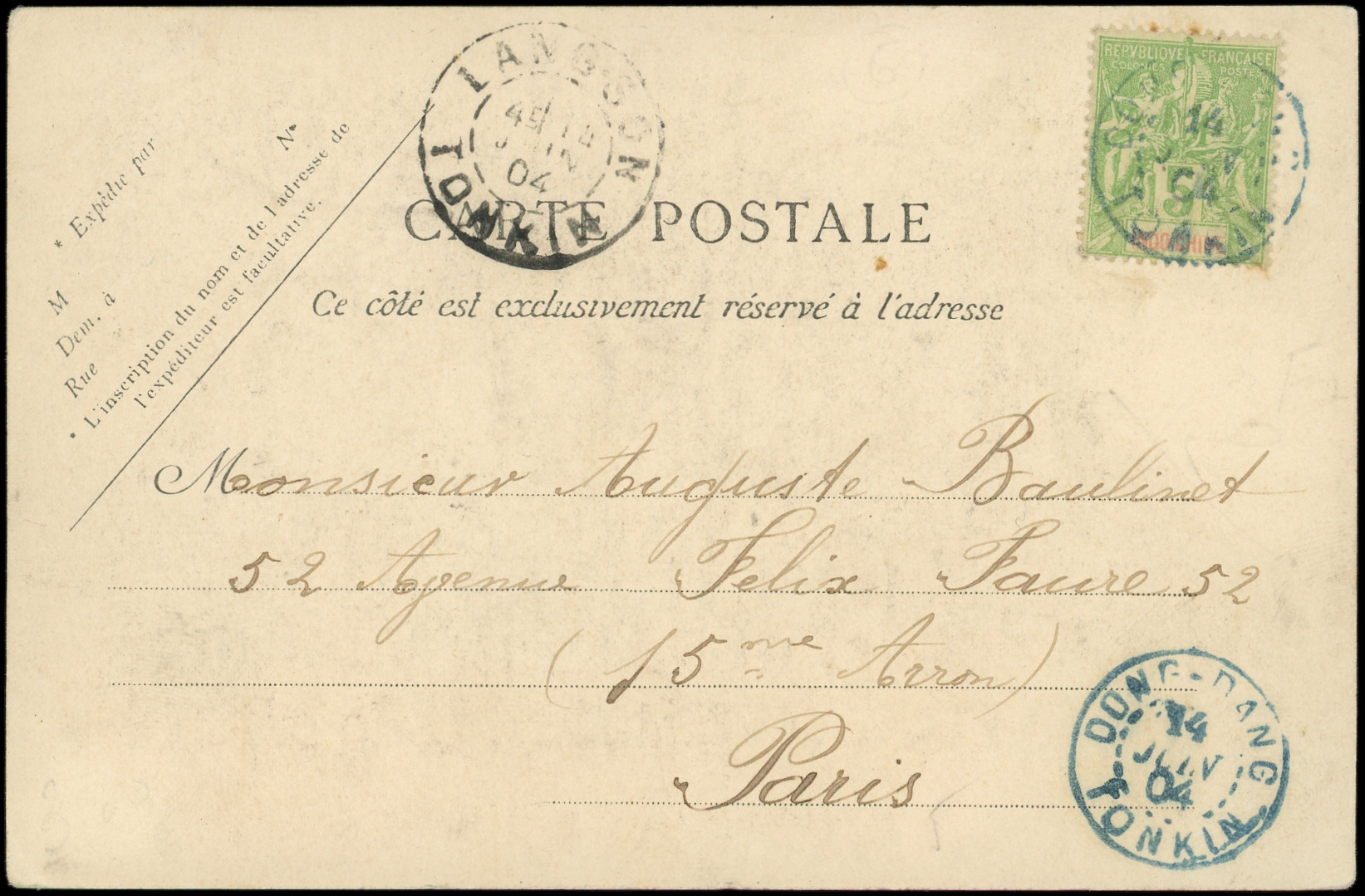 vert-jaune obl. càd DONG-DANG 14/6/04 s. CP Algérie, càd LANG-SON 14/6 pour Paris, TB (Image)