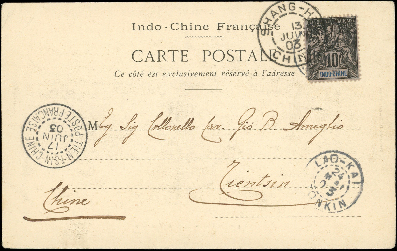 lilas obl. càd LAO-KAI 24/5/03 s. CP, passage SHANG-HAI 13/6 et arr. TIEN-TSIN-CHINE 17/6, TB (Image)