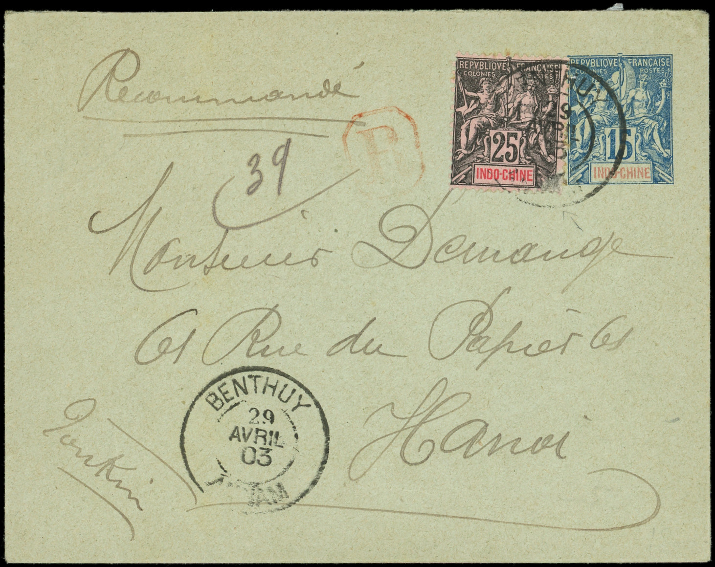 rose obl. càd BENTHUY 29/4/03 s. Env. Entier Rec. 15c. bleu, arr. HANOI, TB (Image)