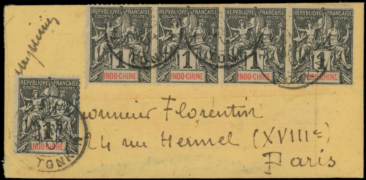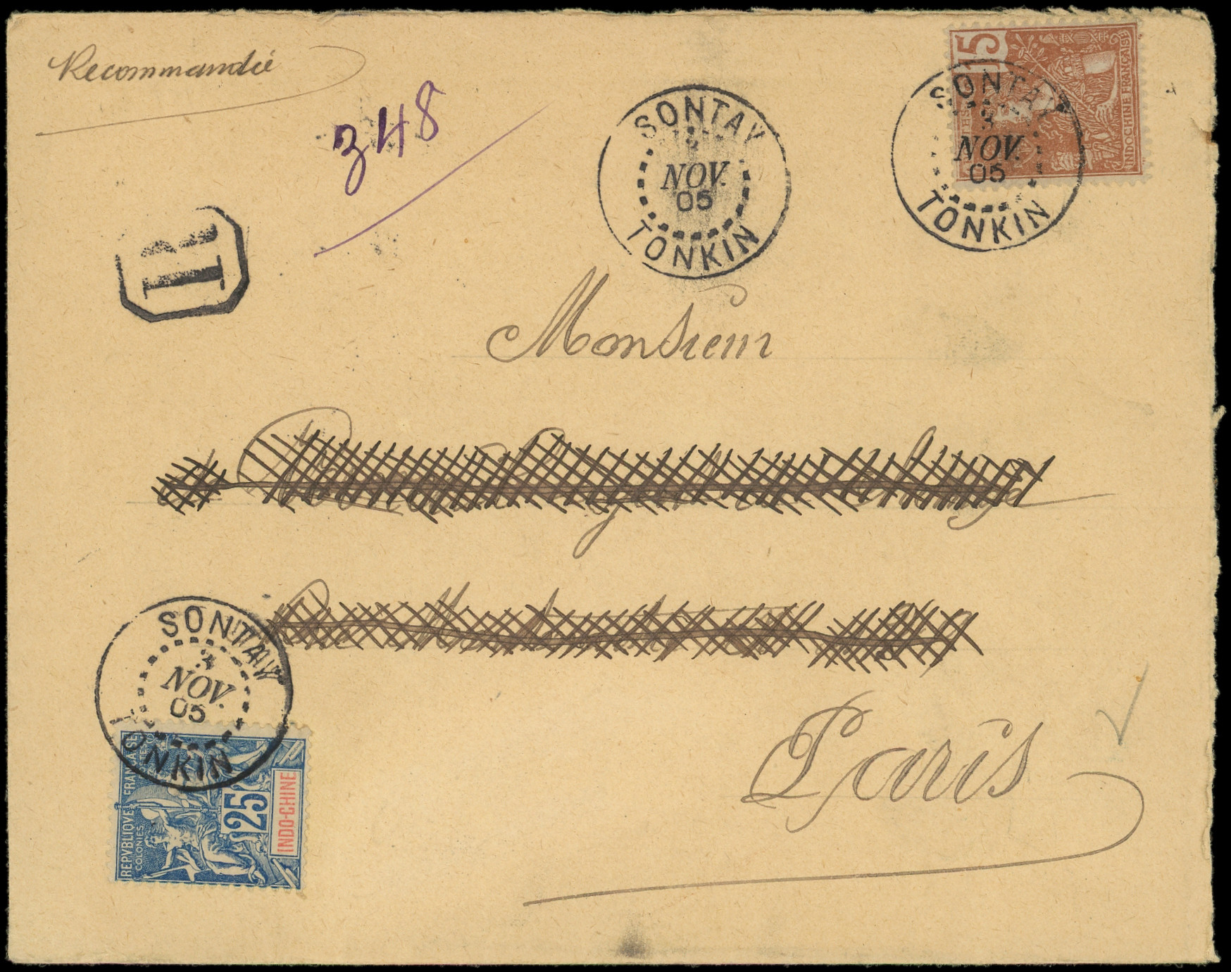 et 15c. obl. SONTAY TONKIN 3/11/05 s. Env. Rec. nom rayé pour Paris 18/12, TB (Image)
