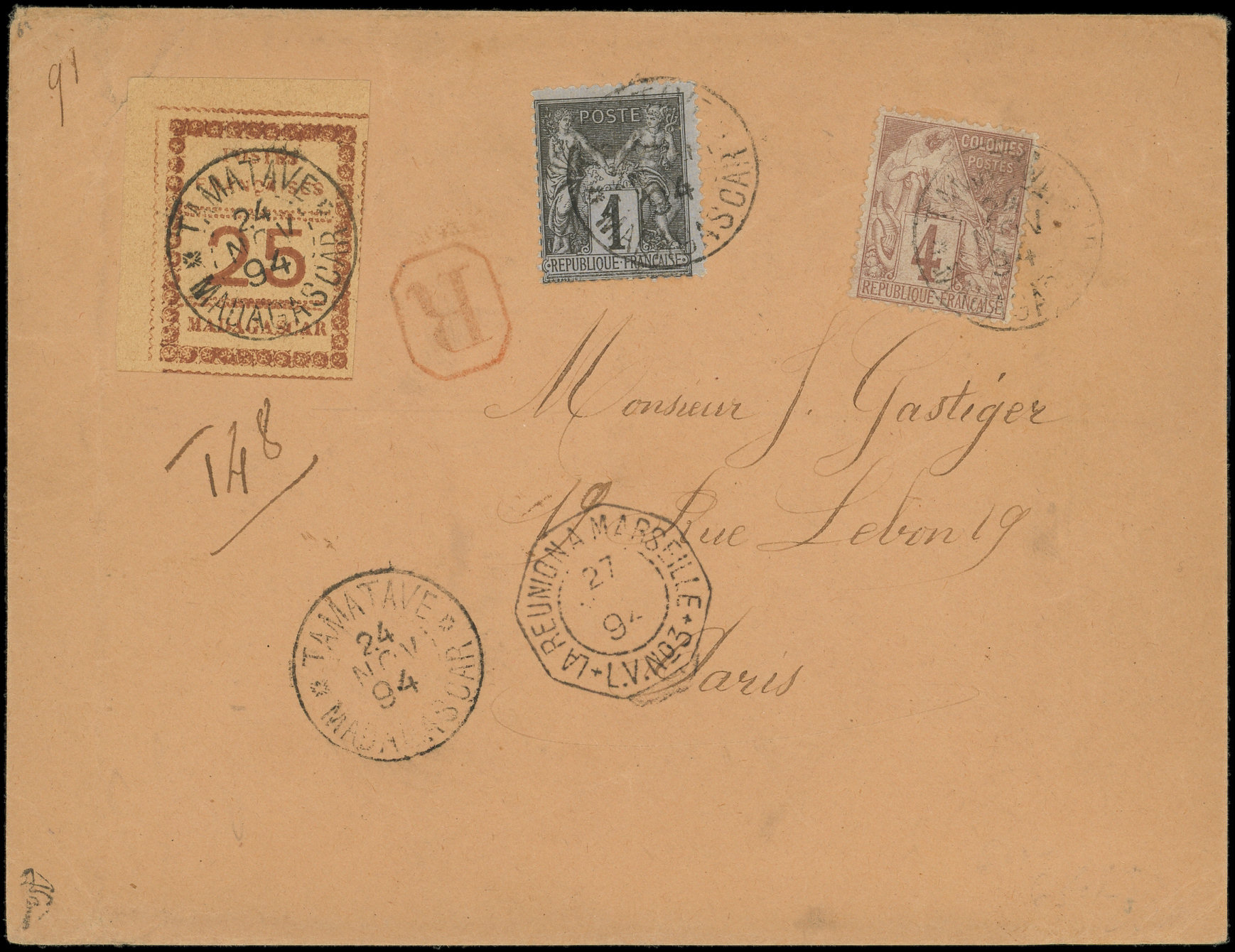 sur chamois, MIXTE avec France N°83 et CG N°48 obl. càd TAMATAVE 24/11/94 s. Env. Rec., arr. PARIS 23/12, RR et TB. J (Image)