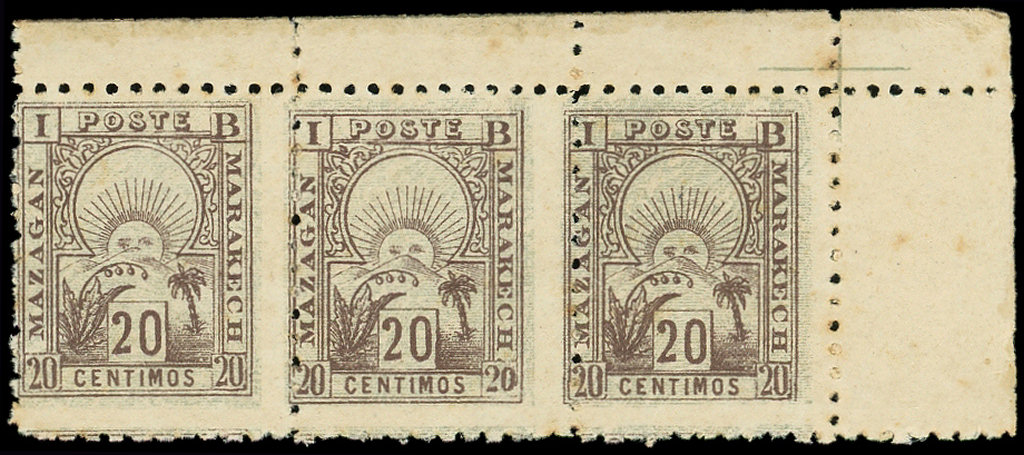 : Mazagan à Marakech, 20c. brun, BANDE de 3, PIQUAGE à CHEVAL, TB (Image)