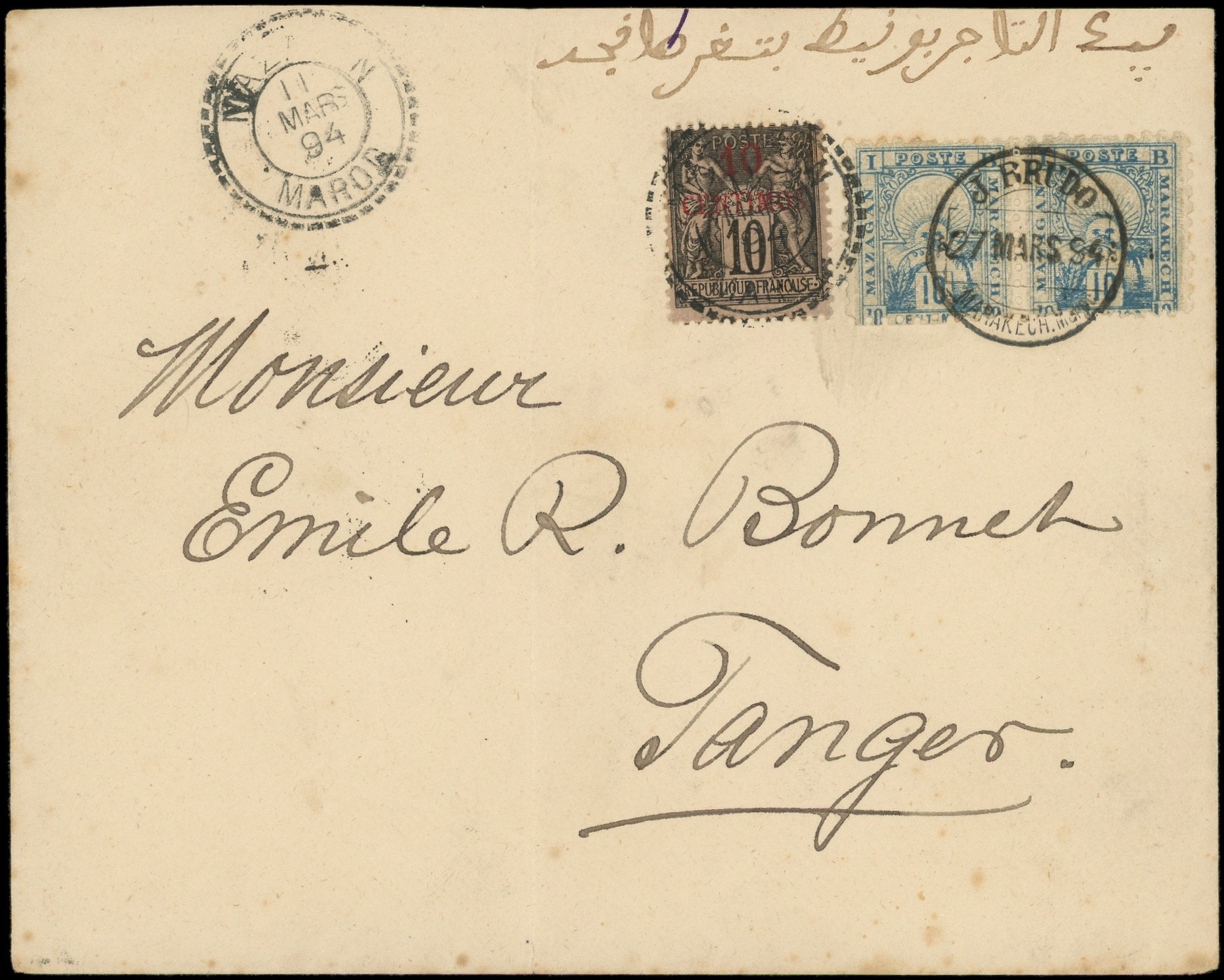 : 10c. bleu Mazagan à Marakech, PAIRE obl. J. BRUDO 27/3/94, MIXTE avec Maroc N°3A 10c. obl. MAZAGAN 11/3, combinaison Rare et TB (Image) (Image2)