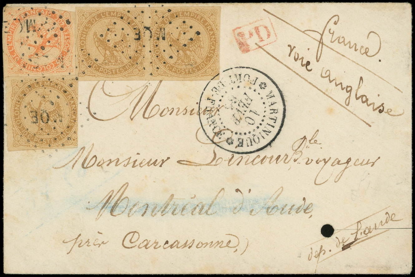 PAIRE + 1 ex. et 40c. déf. obl. Los. MQE s. Env. trouée, càd FORT-DE-FRANCE 10/2/65 pour Carcassonne, frappes TTB (Image)