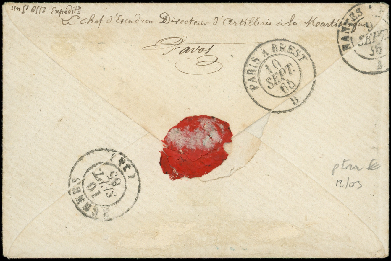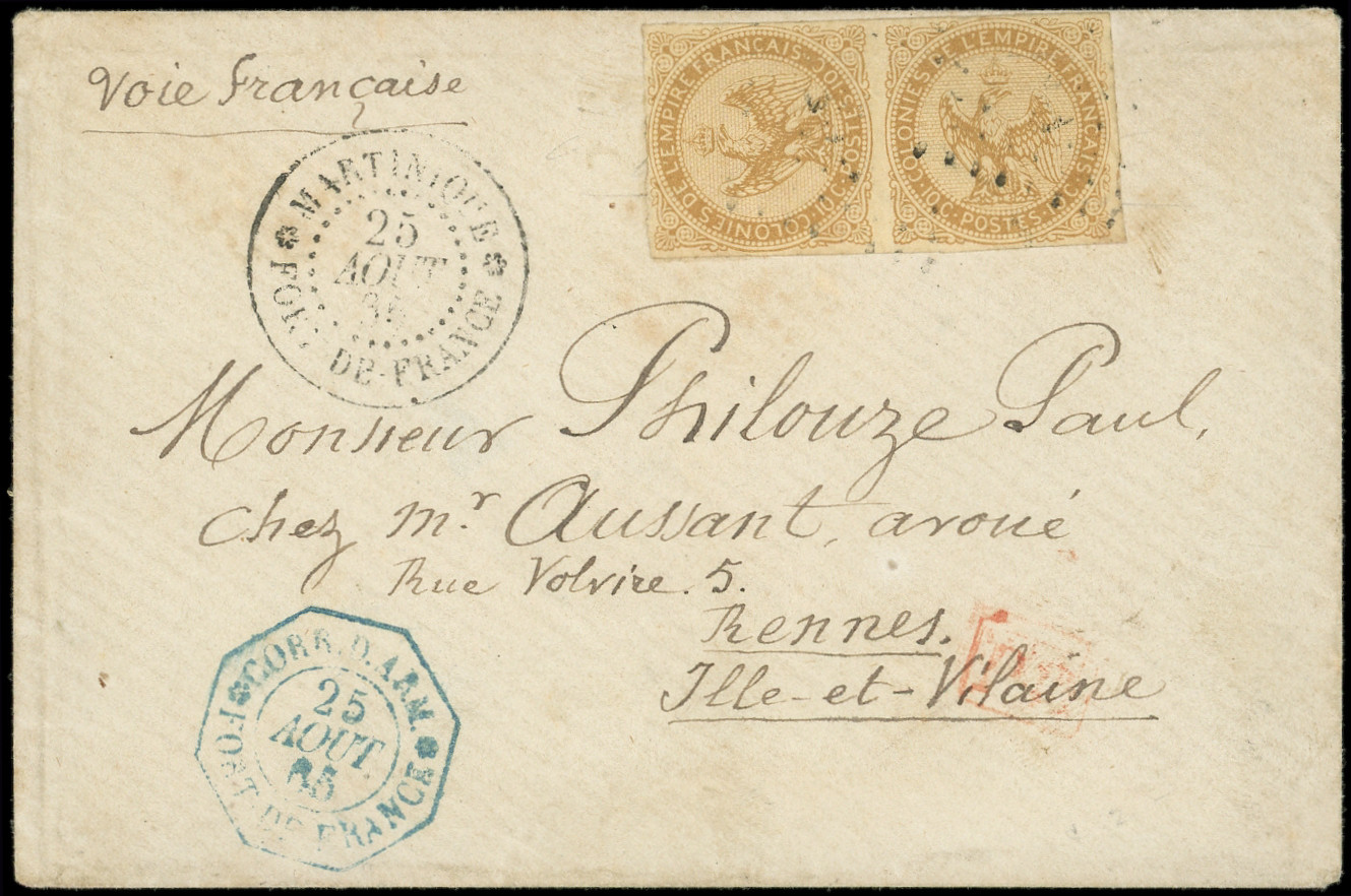 PAIRE dont un timbre COUCHE, petit pli d'archive, obl. Los. s. Env., càd FORT DE FRANCE 25/8/65 et càd Octog. bleu CORR. D. ARM. FORT DE FRANCE, arr. Rennes 10/9, combinaison Rare et TB (Image) (Image2)