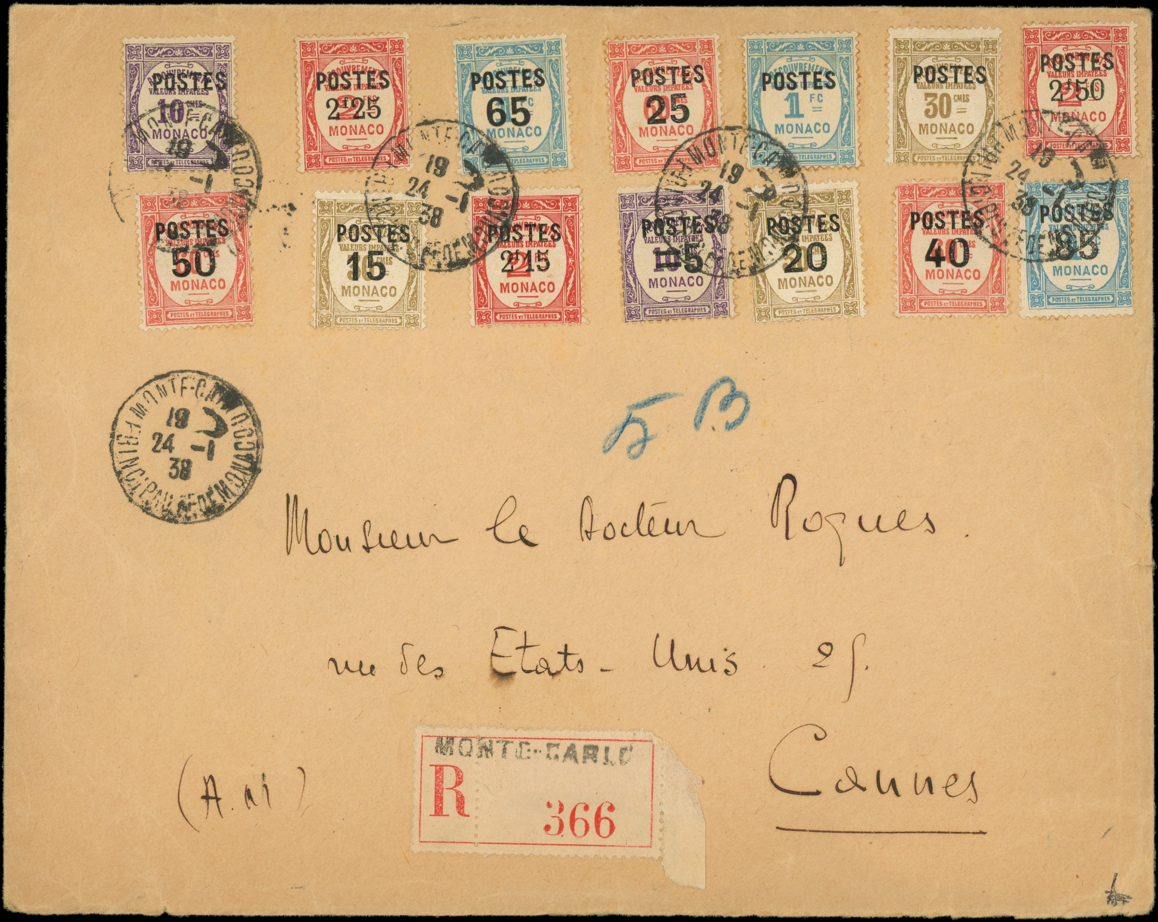 obl. MONTE CARLO 24/1/38 s. Env. Rec., arr. CANNES 25/1, TB (Image) (Image2)