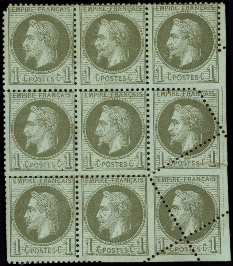 vert-bronze, BLOC de 9, 4 ex. avec PIQUAGE OBLIQUE, 1 ex. normal défx, bloc collé sur support, spectaculaire (Image)