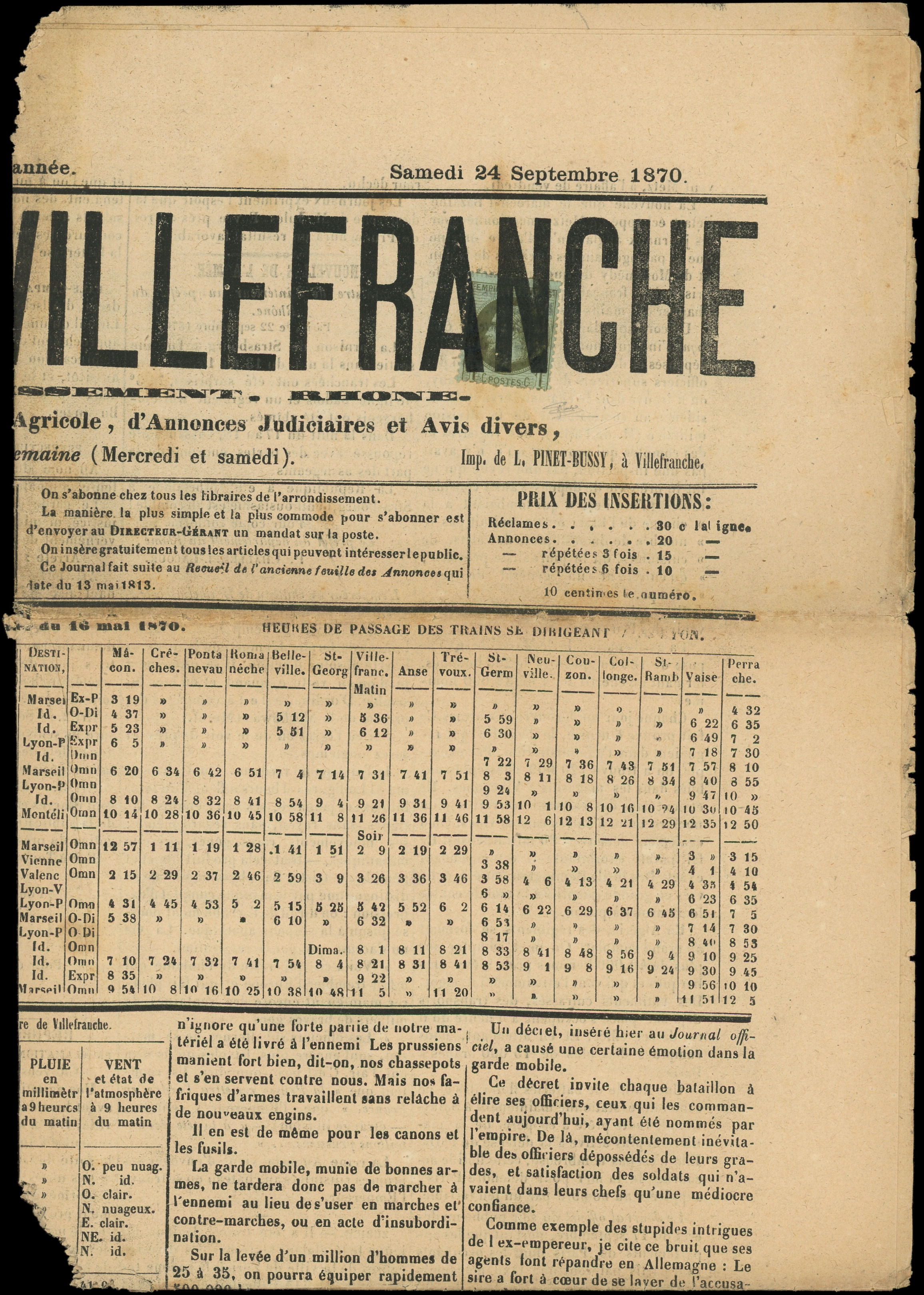 obl. TYPO s. JOURNAL de VILLEFRANCHE du 24/9/70, B/TB, cote Cérès (Image)
