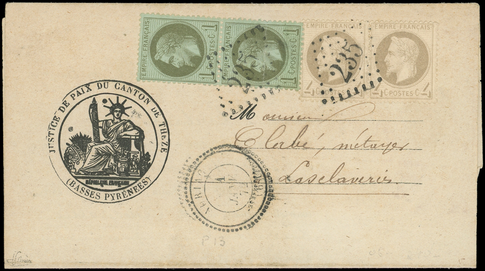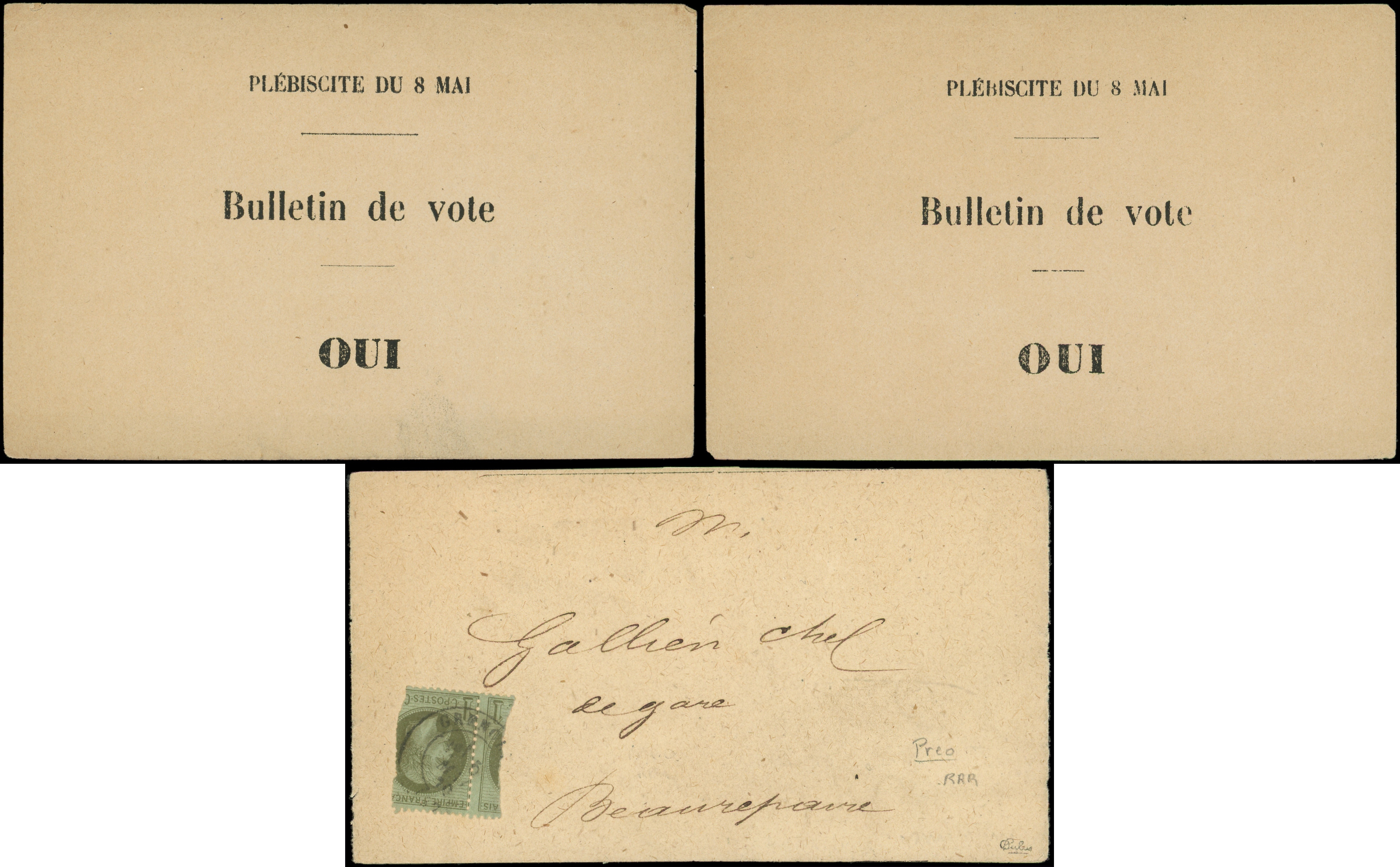 vert-bronze, découpe à cheval, PREOBLITERE T17 GRENOBLE 5/5/70 s. bande avec 2 bulletins de vote pour le Plébiscite du 8 Mai 1870, photo du catalogue Dallay 2009, RR, TB. C