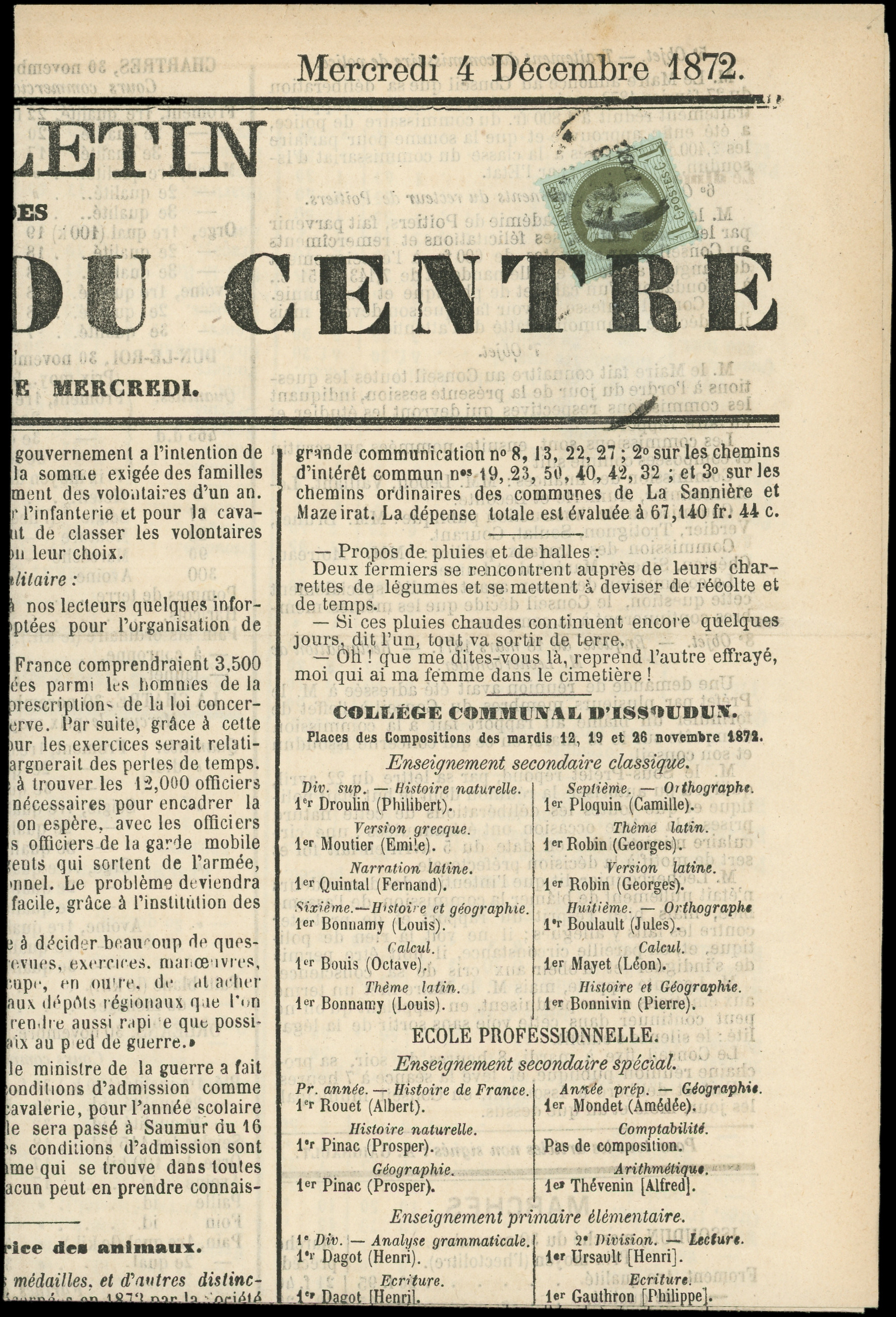 vert-bronze, obl. TYPO et càd (ISSOUDUN) du 3/12/72 s. Journal "Bulletin des Marchés du Centre" du 4/12, Précurseur des Préoblitérés d'Issoudun, RR, TB (Image)