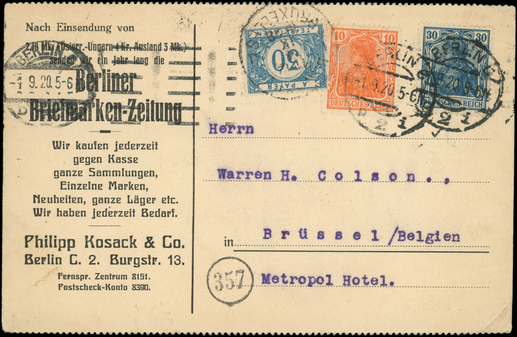 et 30p. obl. s. Carte sans mention "Carte Postale" d'où la TAXATION à 30c. BELGIQUE à l'arrivée à BRUXELLES 4/9/20, TB (Image)