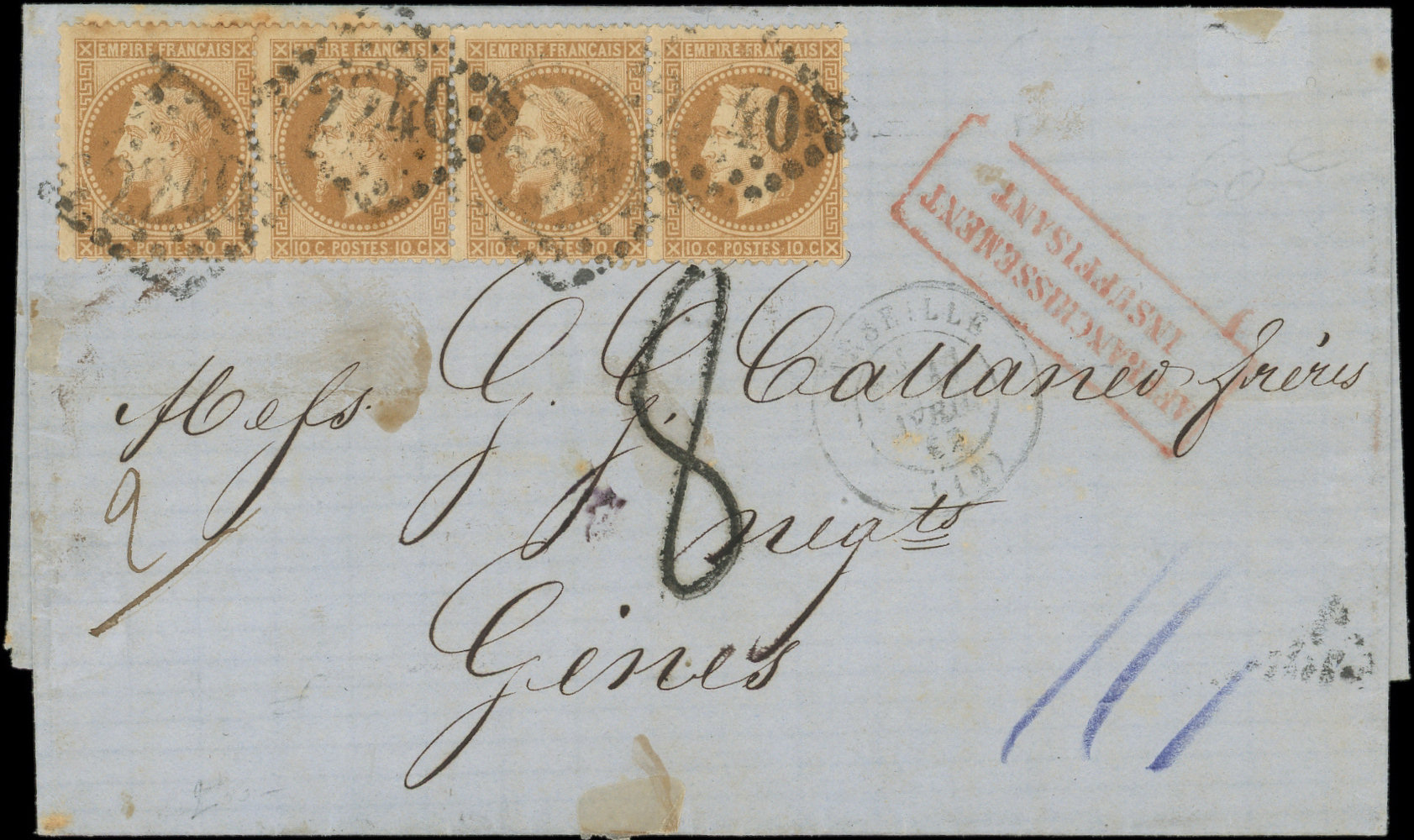 bistre-brun T I, BANDE de 4 obl. GC 2240 s. LSC, càd Marseille 17/4/69, "affrt insuff." et TAXE 8, arr. GENOVA 19/4, TB (Image) (Image2)