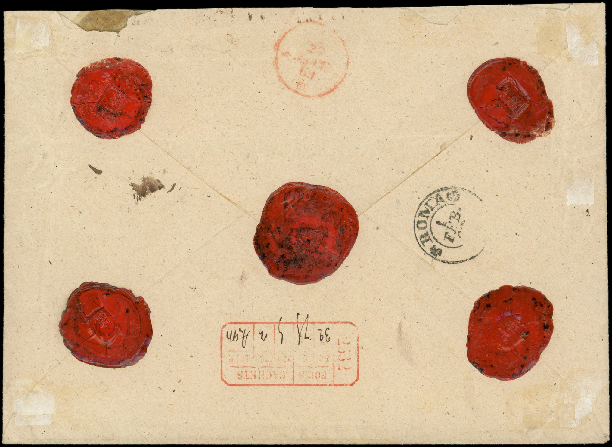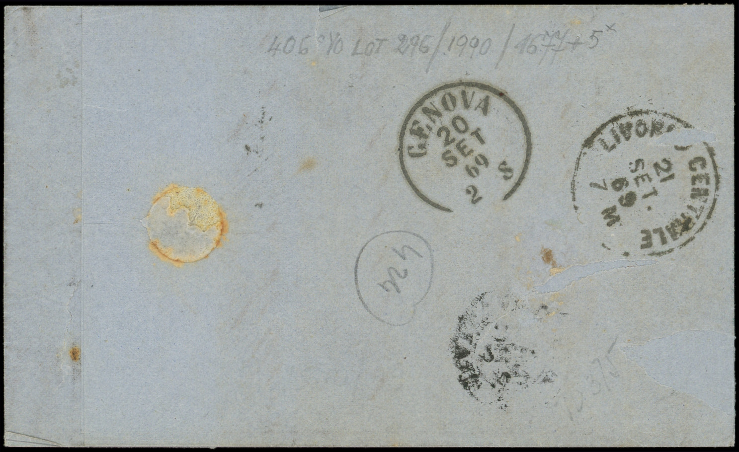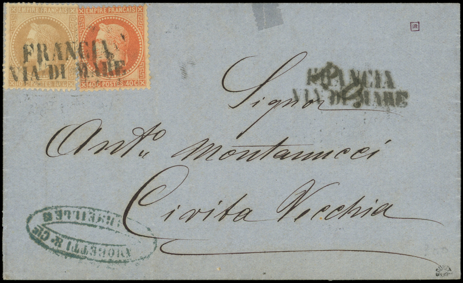 40c. obl. griffe FRANCIA/VIA DI MARE répétée à côté s. LSC de Marseille pour CIVITA VECCHIA, passage GENOVA 20/9/69 et LIVORNO CENTRALE 21/9, TTB (Image) (Image2)