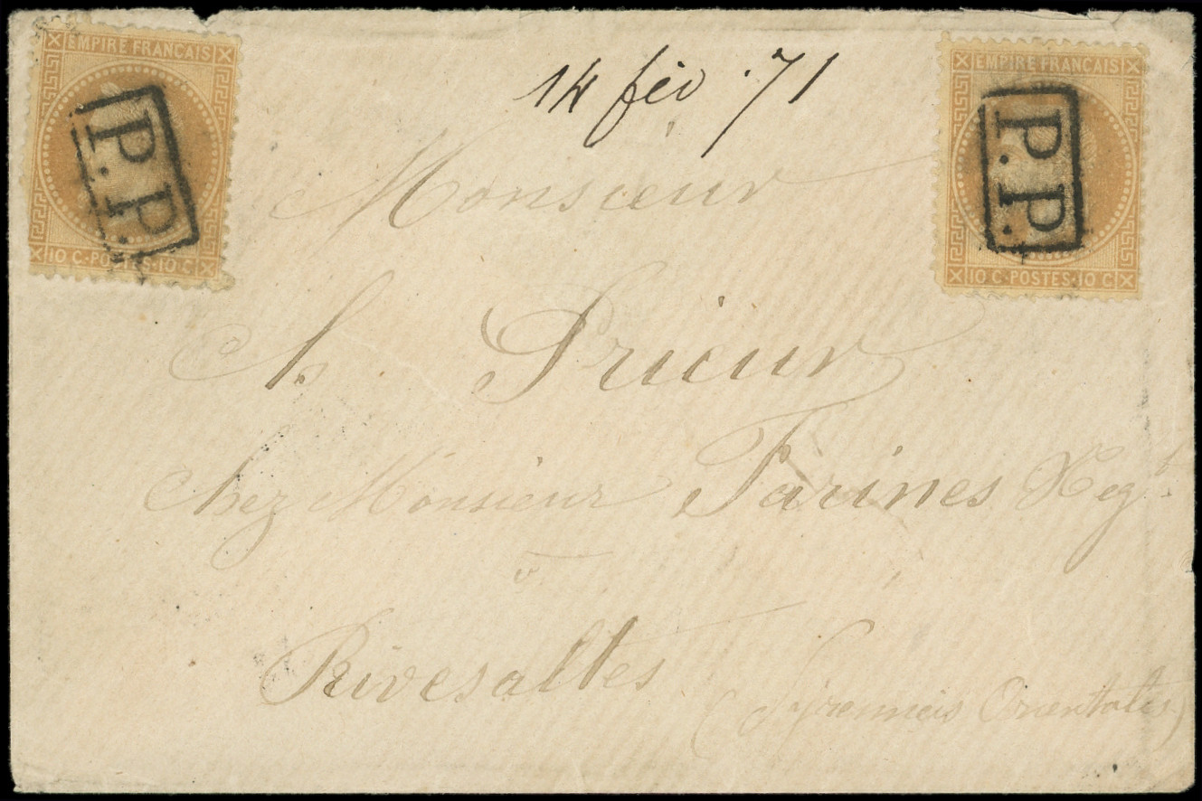 T II, 2 ex. dont un déf. obl. P.P. encadré s. Env. "14 fev. 71" à la plume, arr. RIVESALTES 25/2, TB (Image) (Image2)