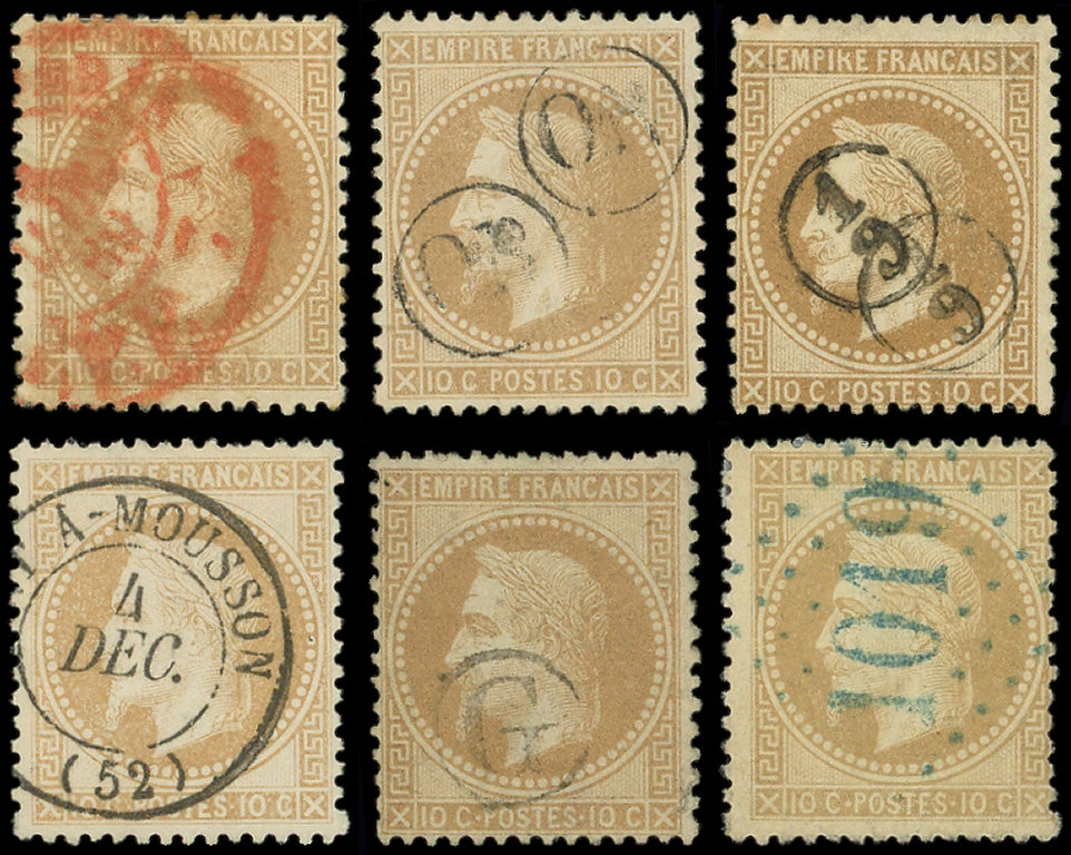 bistre, 6 ex. obl. càd T15, càd rouge Imprimés, facteur 1/9, OR, 6 dans un cercle, GC bleu, TB/TTB (Image)