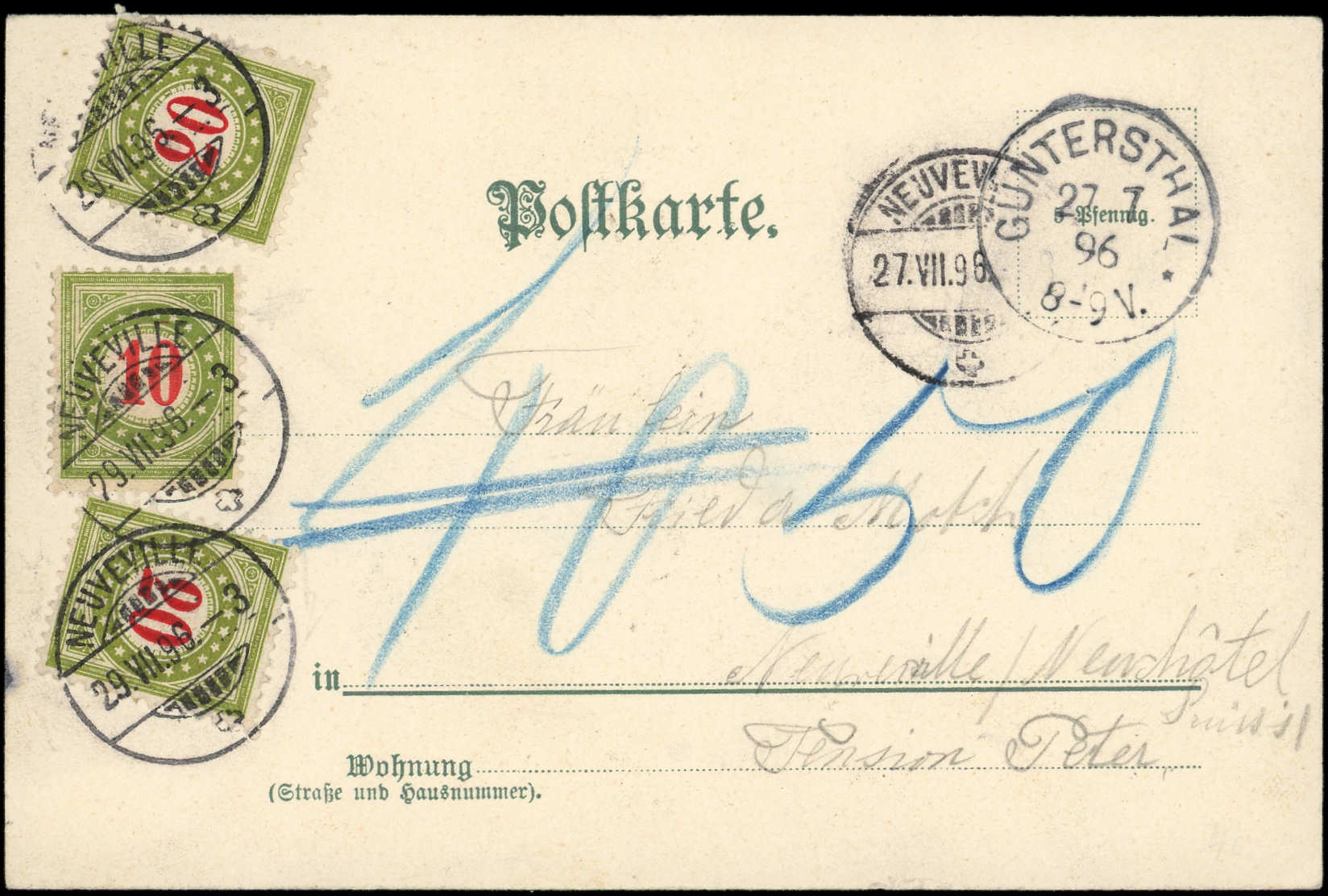 10c. et 20c. (2) obl. NEUVEVILLE 29/7/96 s. CP de GUNTERSTHAL ALLEMAGNE non affranchie, TB (Image)