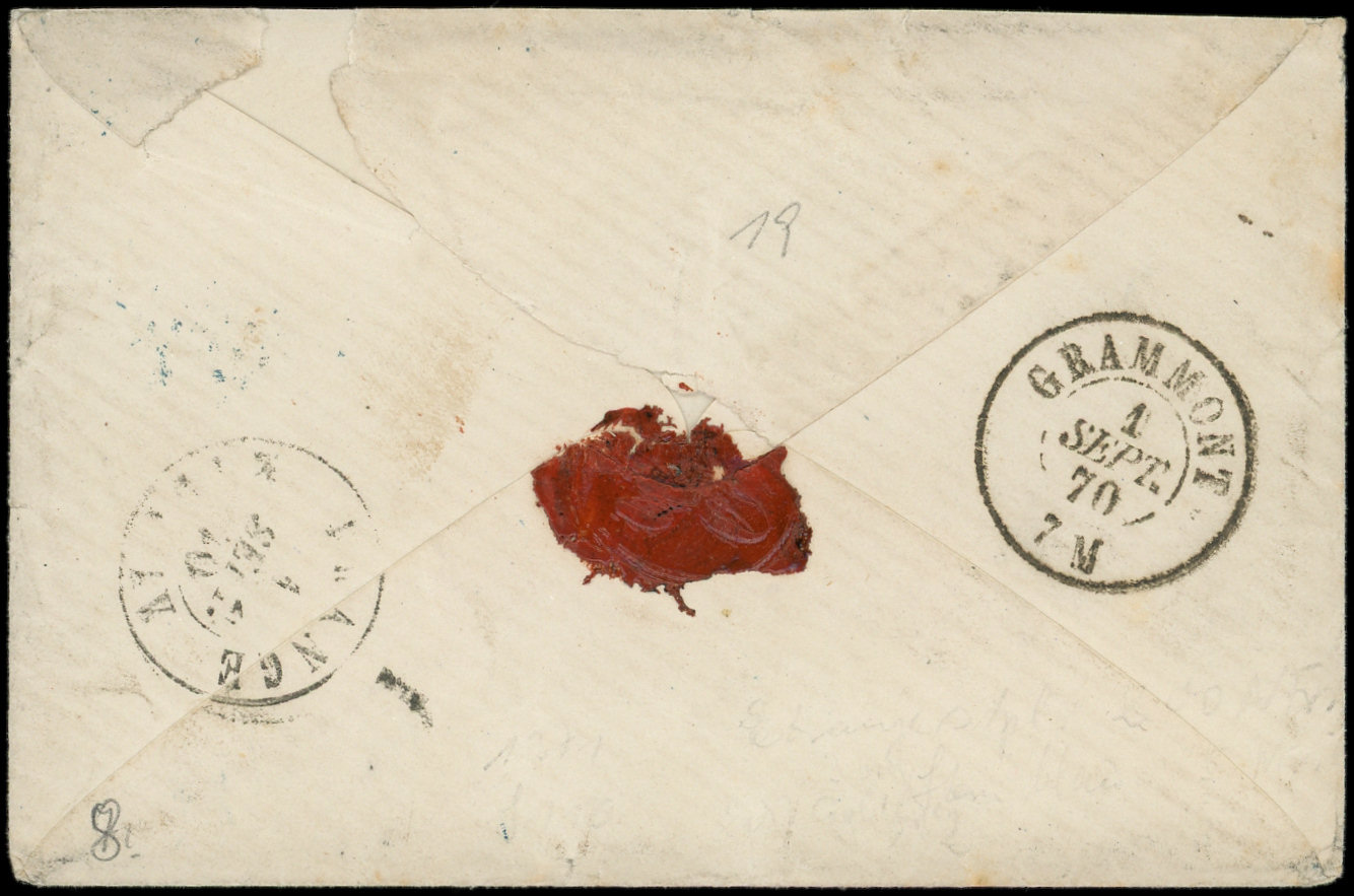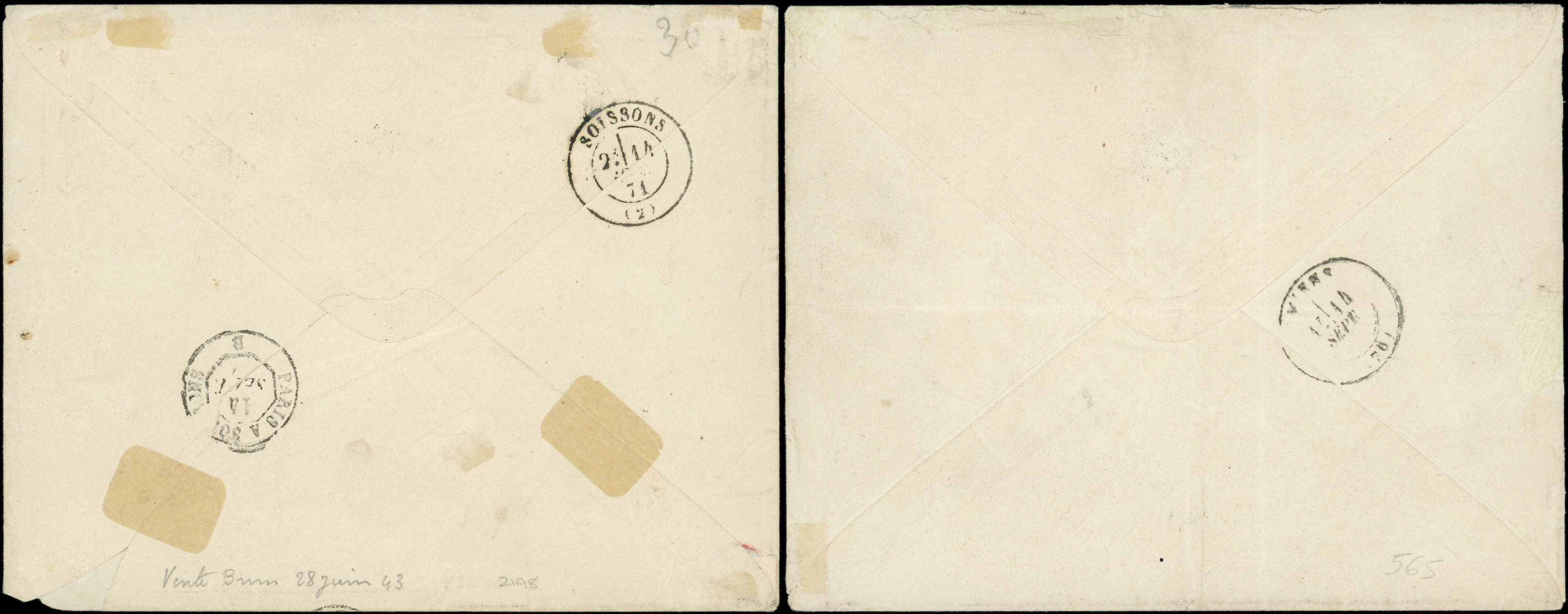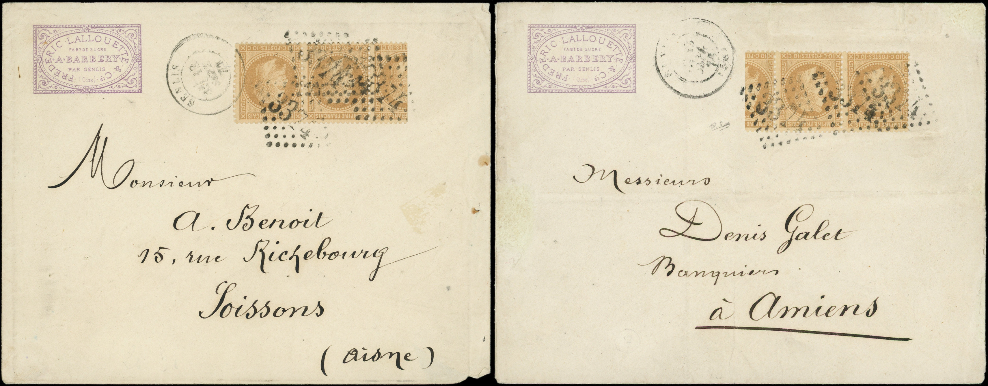 T I, BANDE de 6 COUPEE pour être utilisée s. 2 Env. affr. chacune à 25c. avec une paire + 1 t. COUPE, obl. GC 3374, càd T17 SENLIS 13/9/71. L'une pour Soissons, l'autre pour Amiens 14/9. Pièces provenant d'une vente Brun de Juin 1943. TRES GRANDE