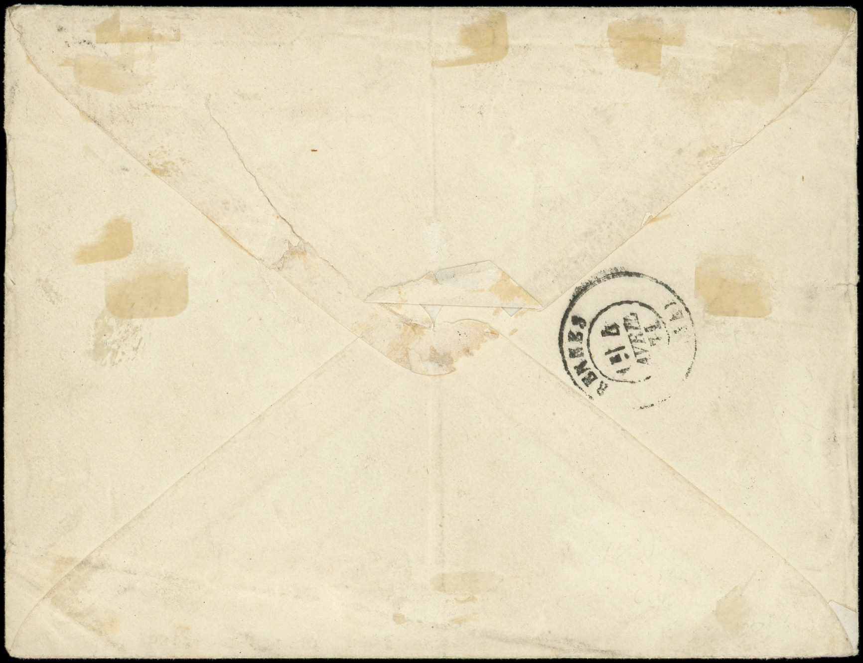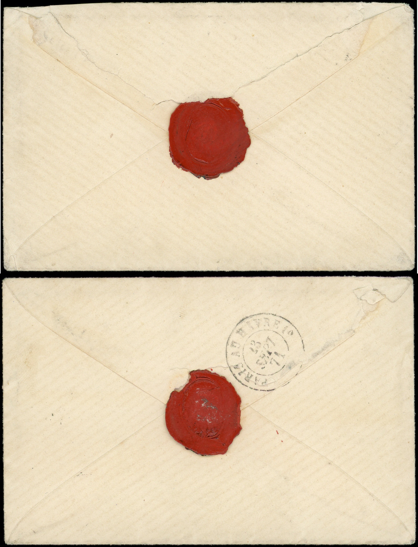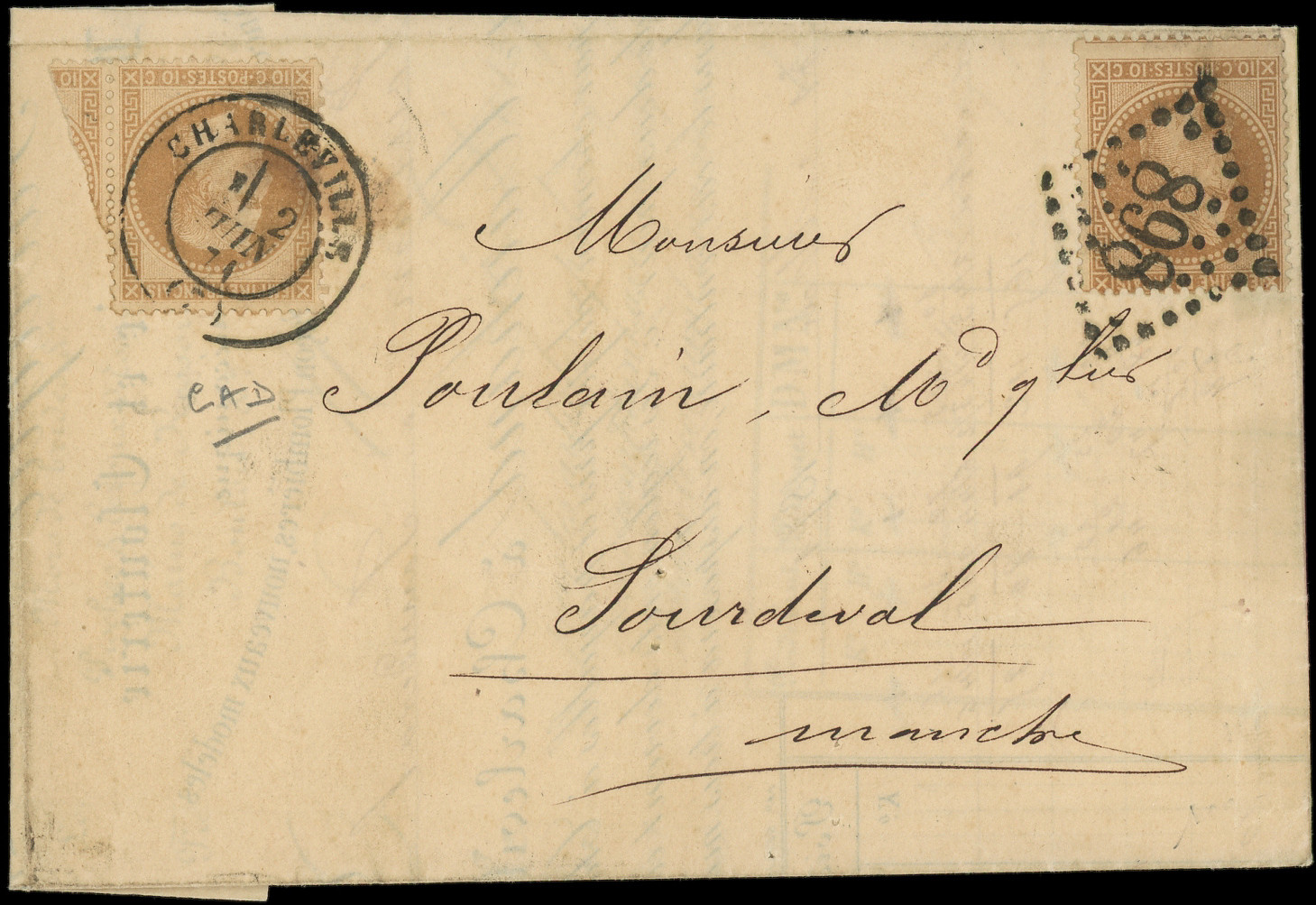 T I, BANDE de 6 COUPEE pour être utilisée s. 2 Env. affr. chacune à 25c. avec une paire + 1 t. COUPE, obl. GC 3374, càd T17 SENLIS 13/9/71. L'une pour Soissons, l'autre pour Amiens 14/9. Pièces provenant d'une vente Brun de Juin 1943. TRES GRANDE