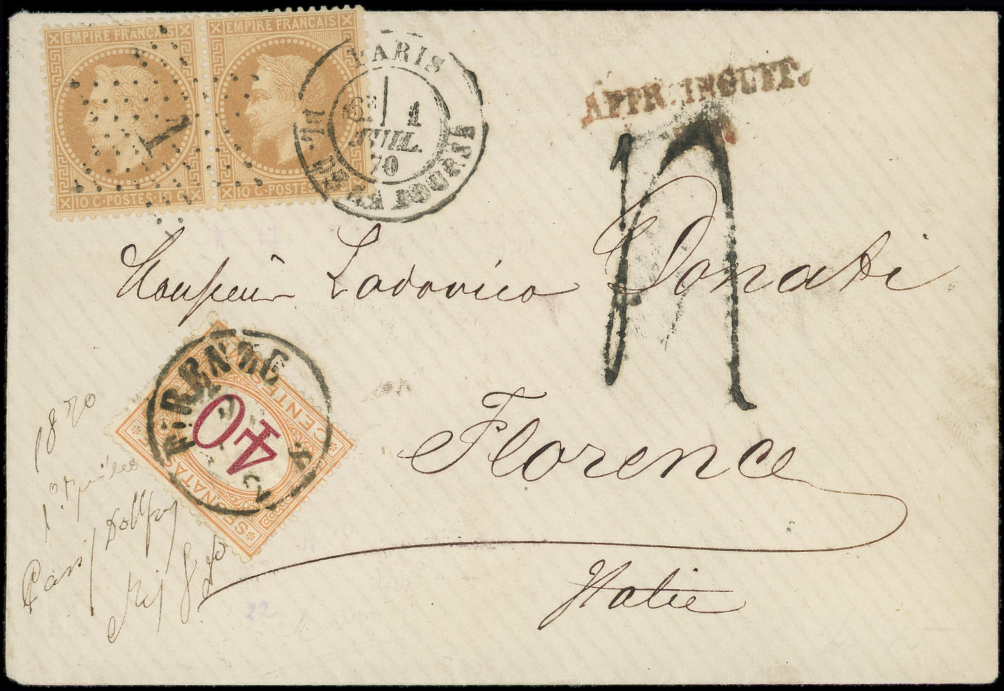 T II, PAIRE obl. Etoile 1 s. Env., càd Pl. de la Bourse 1/7/70, "affrt insuff." et TAXE 40c. Italien à l'arrivée à FIRENZE, TTB (Image)