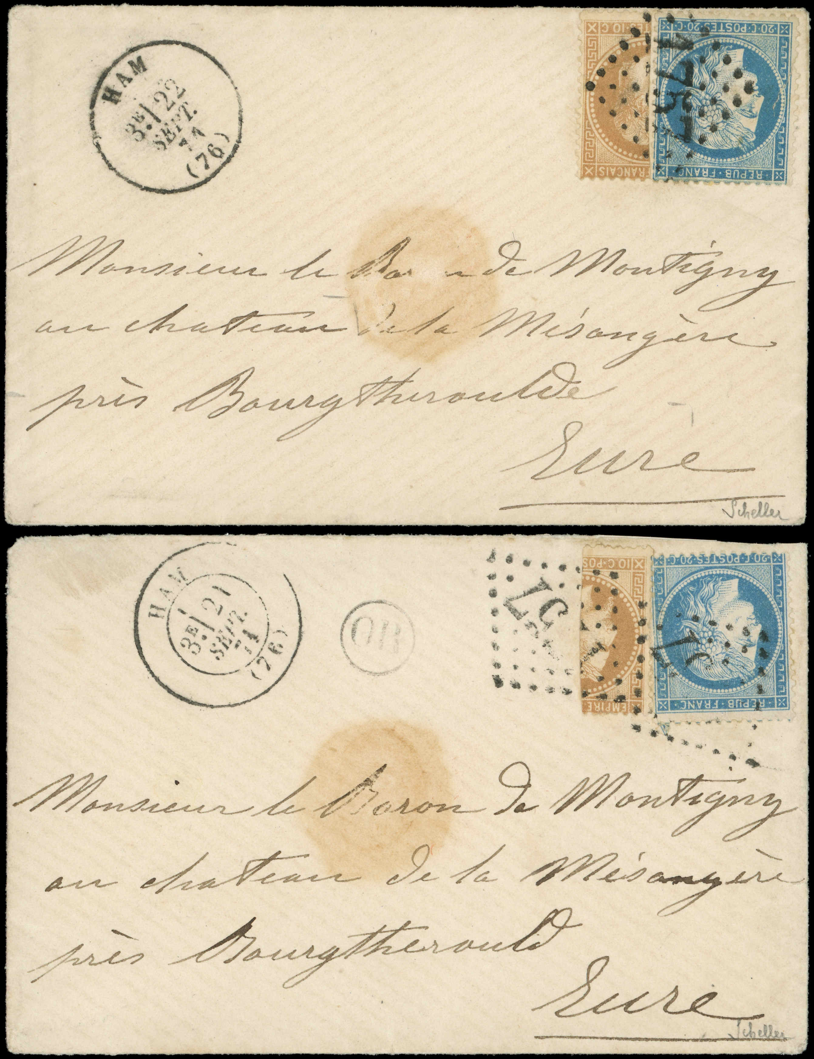 T II, ensemble de 2 Lettres présentant le timbre COUPE pour faire 5c. et accompagné d'un N°37 20c. bleu. Les 2 sont obl. GC 1757. La 1ère avec un cachet T17 HAM 21/9/71, la 2e avec un cachet T16 HAM 22/9 et adressées au même destinataire. Ceci