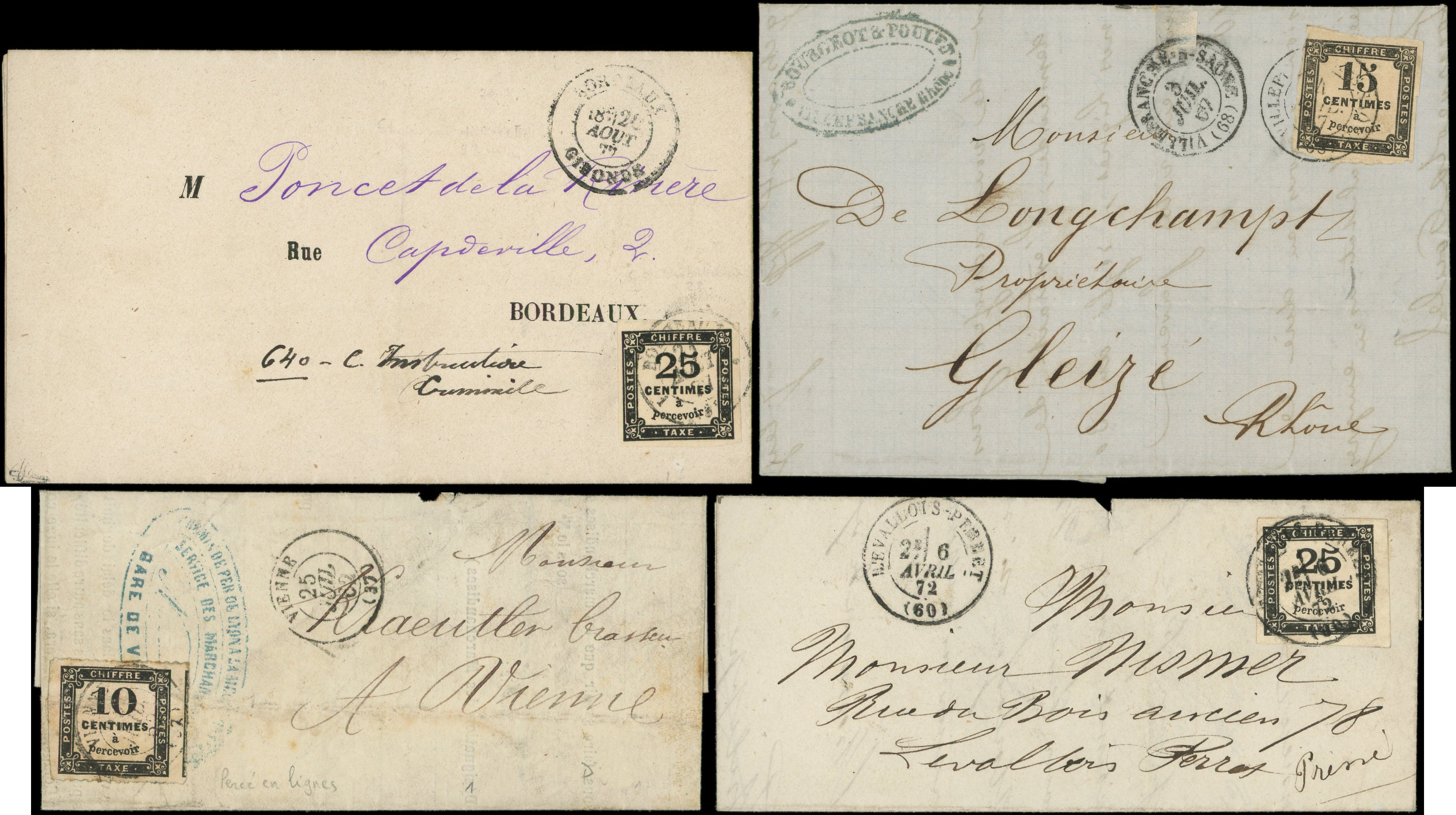 affr. Taxe carrés dont 1 PERCE en LIGNES (pli d'archive), 1862-77, TB (Image)