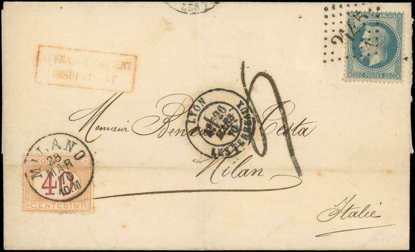 I, obl. GC 2145A LYON les TERREAUX 26/3/70 s. LAC pour Milan TAXEE avec 40c. orange obl. MILANO 28/3, TTB (Image)