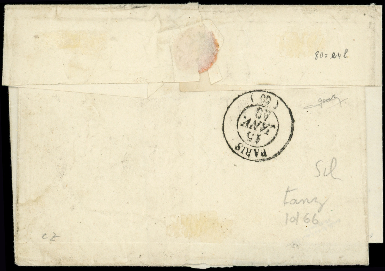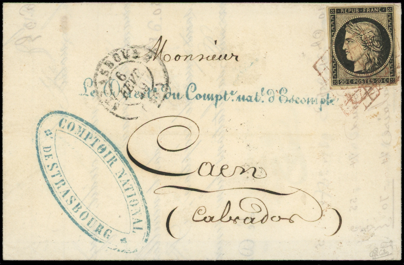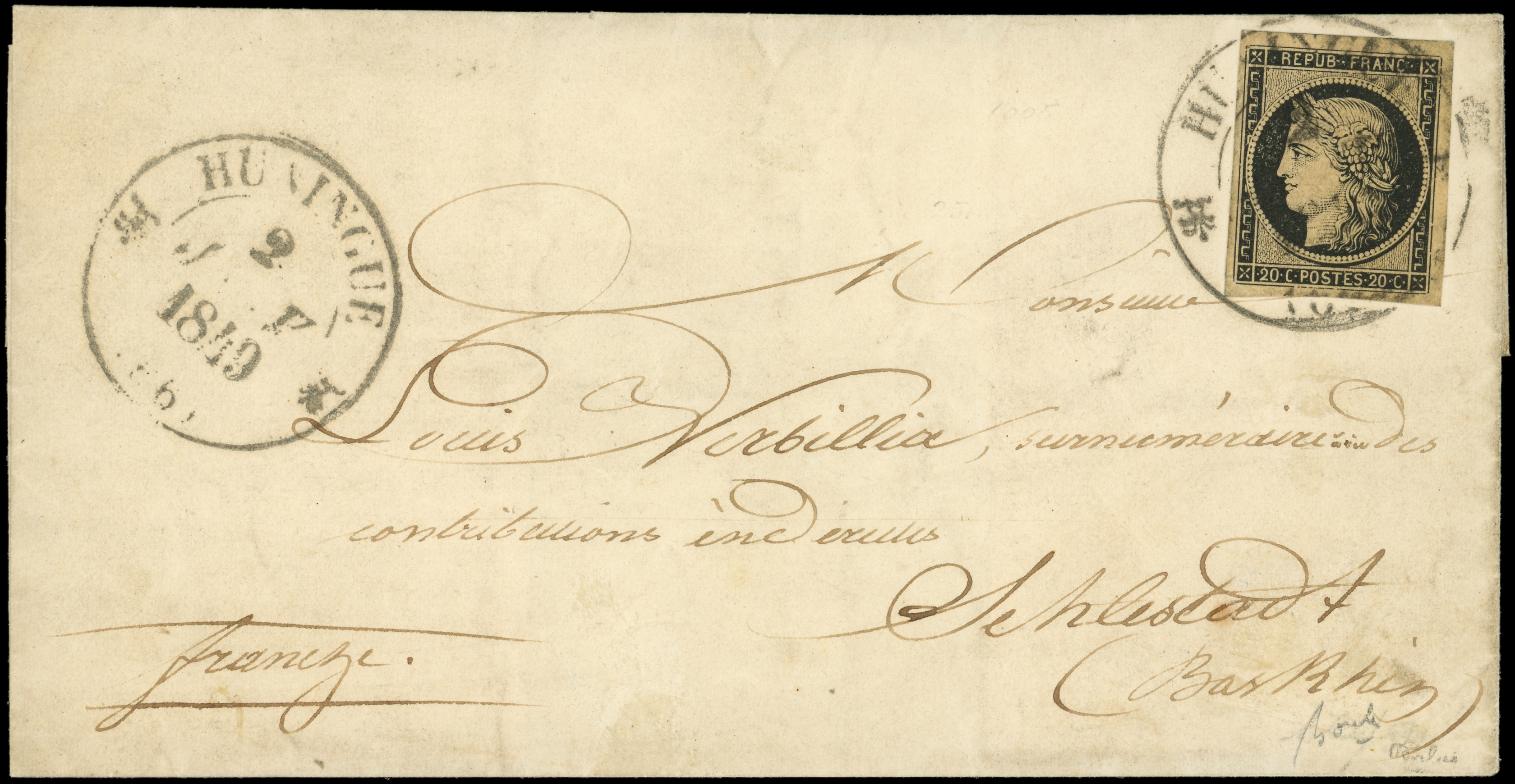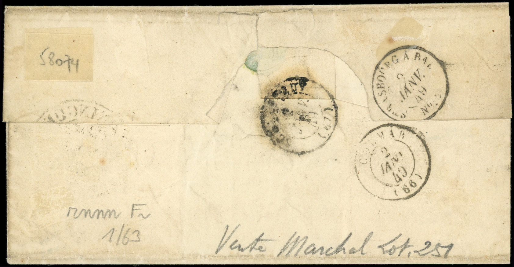 sur jaune, obl. càd T12 HUNINGUE 2 JANV 1849 répété à côté s. LSC, passage COLMAR et arr. SCHLESTADT 2/1, pièce exceptionnelle d'une grande qualité (Image) (Image2)