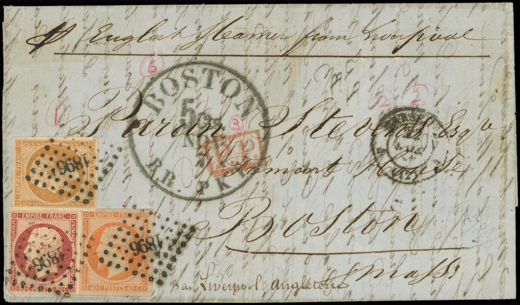 10c. bistre, 40c. orange et 80c. carmin obl. PC 1896 s. LAC, càd Marseille 22/10/56, arr. BOSTON via Liverpool, Superbe (Image) (Image2)