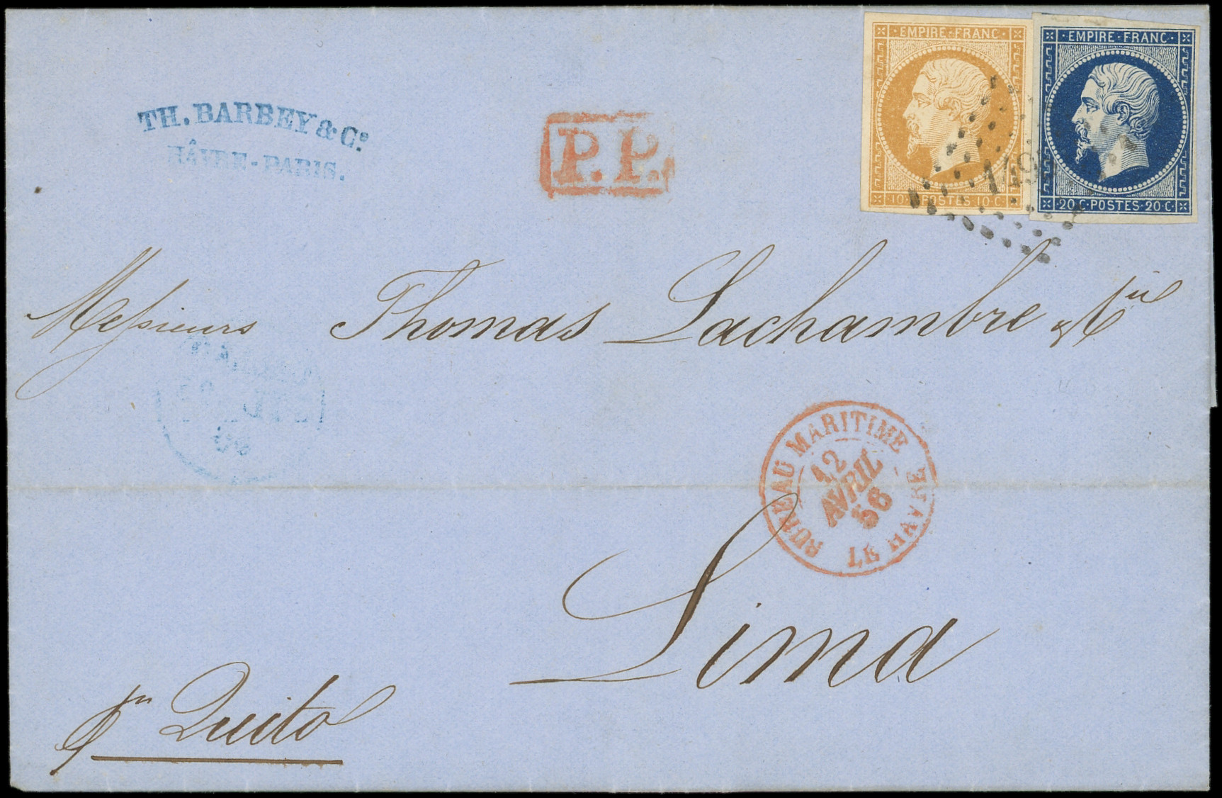 et 20c. obl. PC 1495 s. LAC, càd ROUGE BUREAU MARITIME LE HAVRE 12/4/56, arr. CALLAO 25/6 pour LIMA, RR tarif des bâtiments de commerce, Superbe (Image) (Image2)