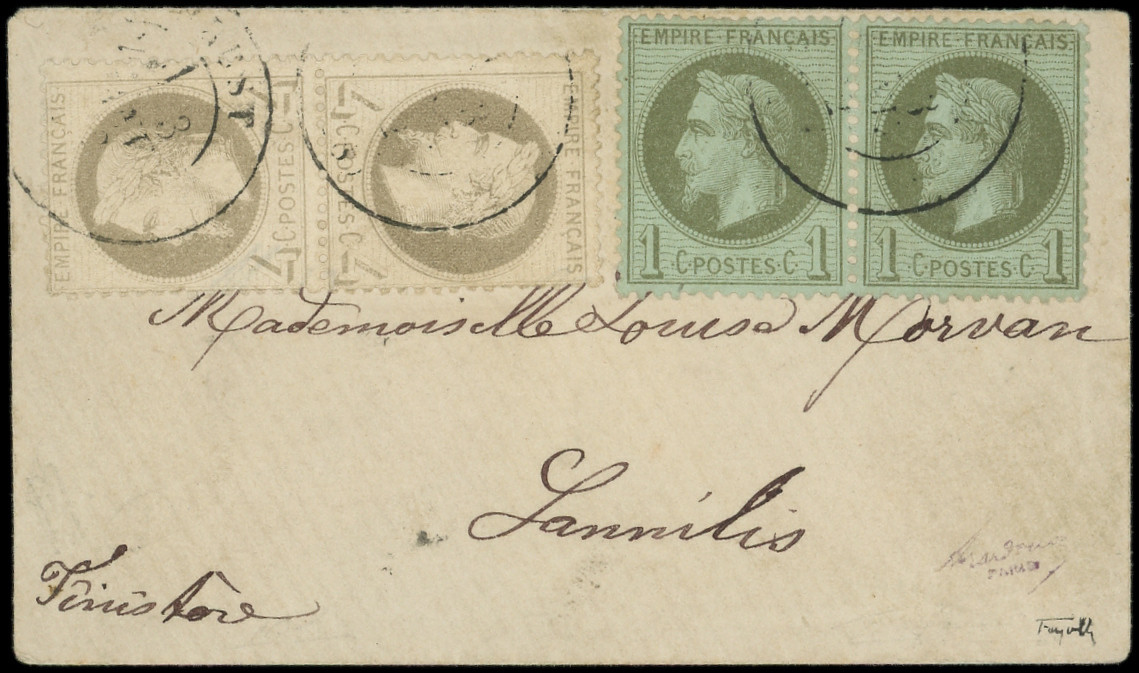 PAIRE TETE BECHE et N°25 1c. olive PAIRE, obl. càd T17 BREST s. petite Env., arr. LANNILIS 4/1/72, grande RARETE, TTB, certif. JF Brun (Image) (Image2)
