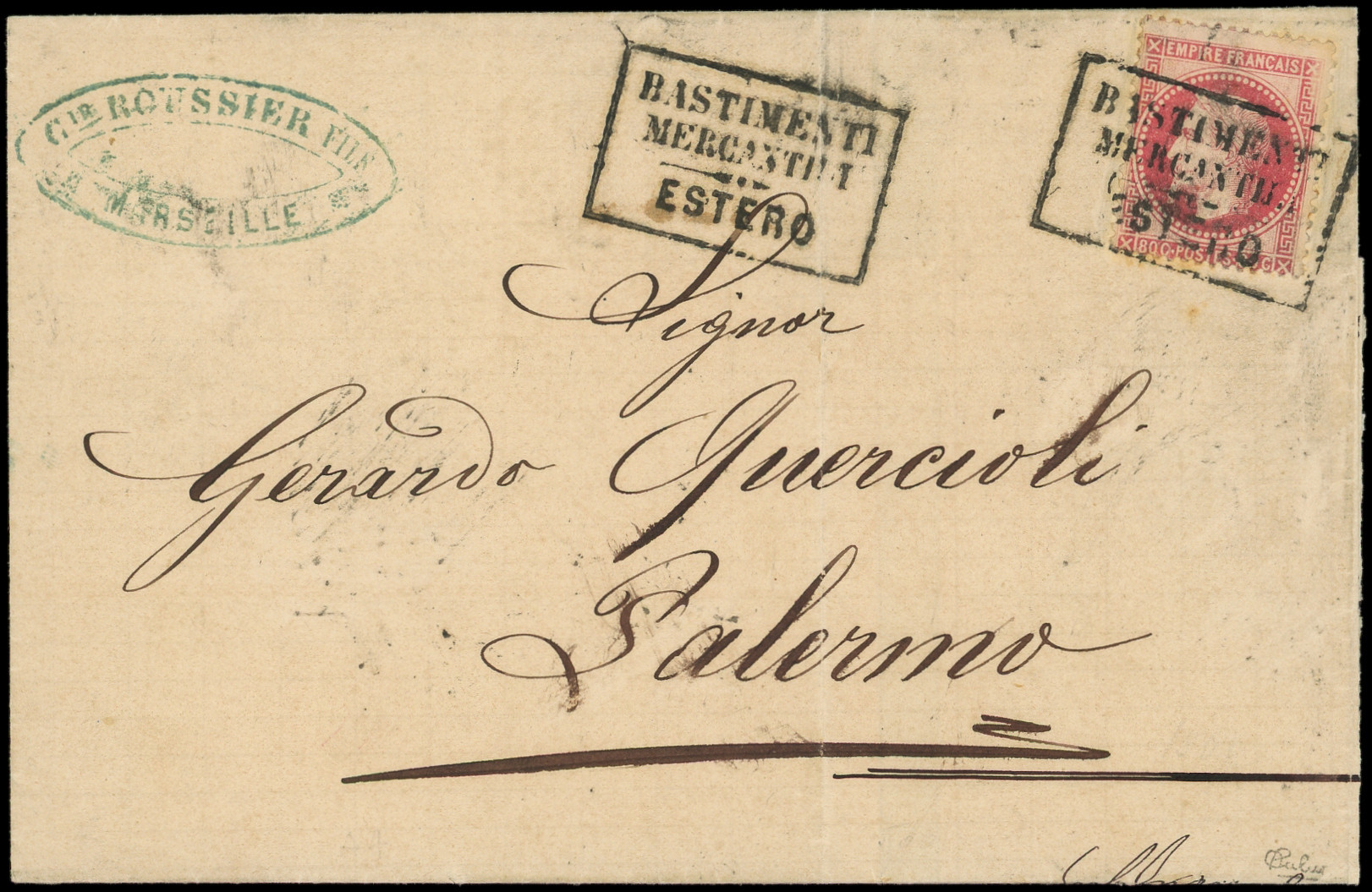 obl. griffe BASTIMENTI/MERCANTILI/ESTERO s. LSC de Marseille, arr. PALERMO 30/4/68, oblitération RR sur le timbre, TTB. C (Image) (Image2)