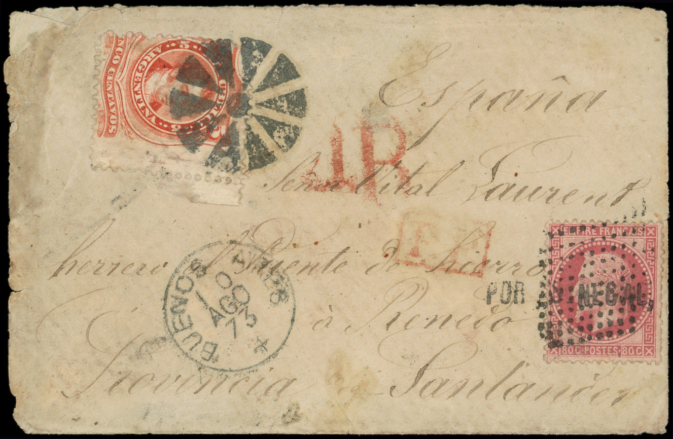 obl. Los. de 144 points et Griffe POR (SE)NEGAL s. Env., MIXTE avec 5c. rouge d'ARGENTINE, càd BUENOS AIRES 10/8/73, TAXE 4R à l'arrivée à SANTANDER, RR, TB (Image) (Image2)