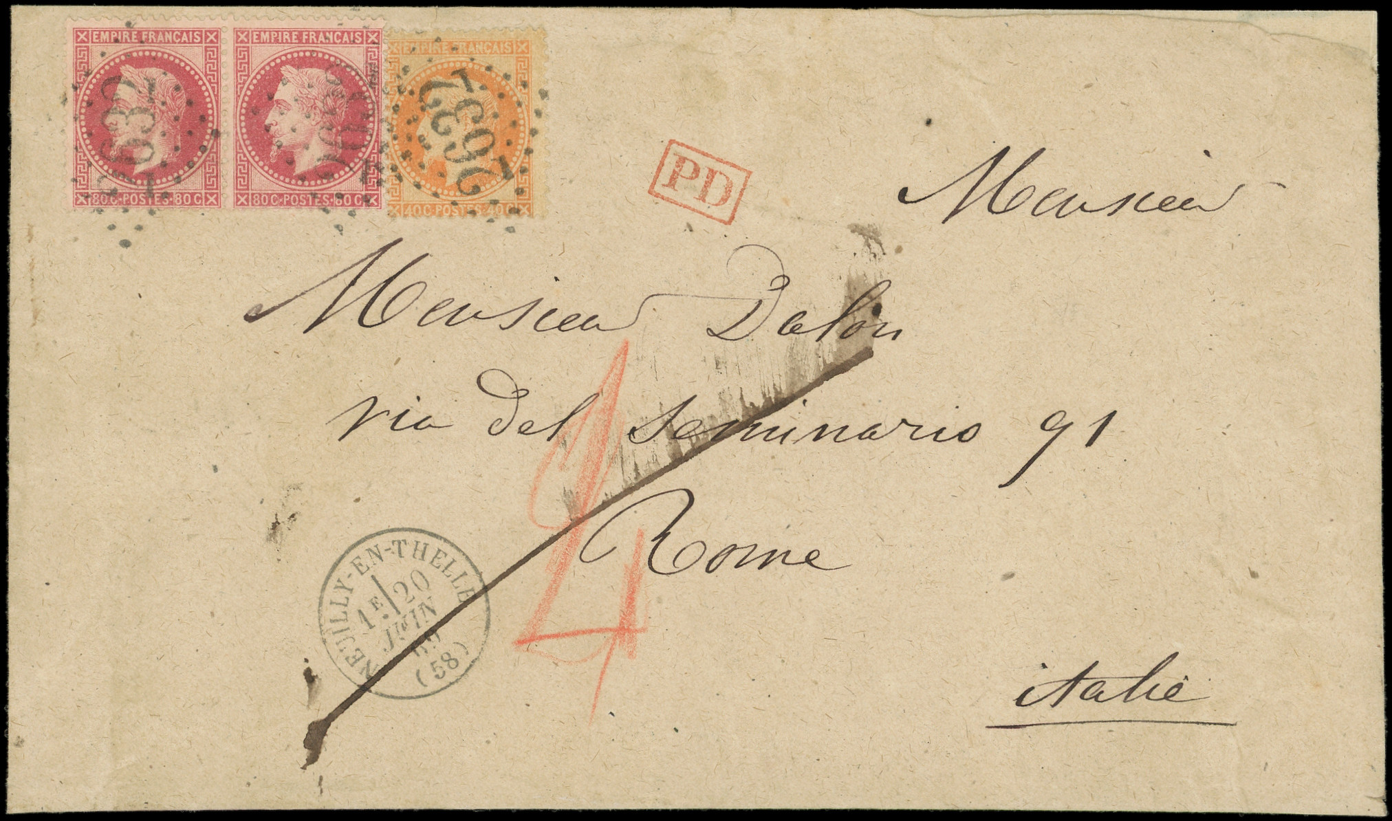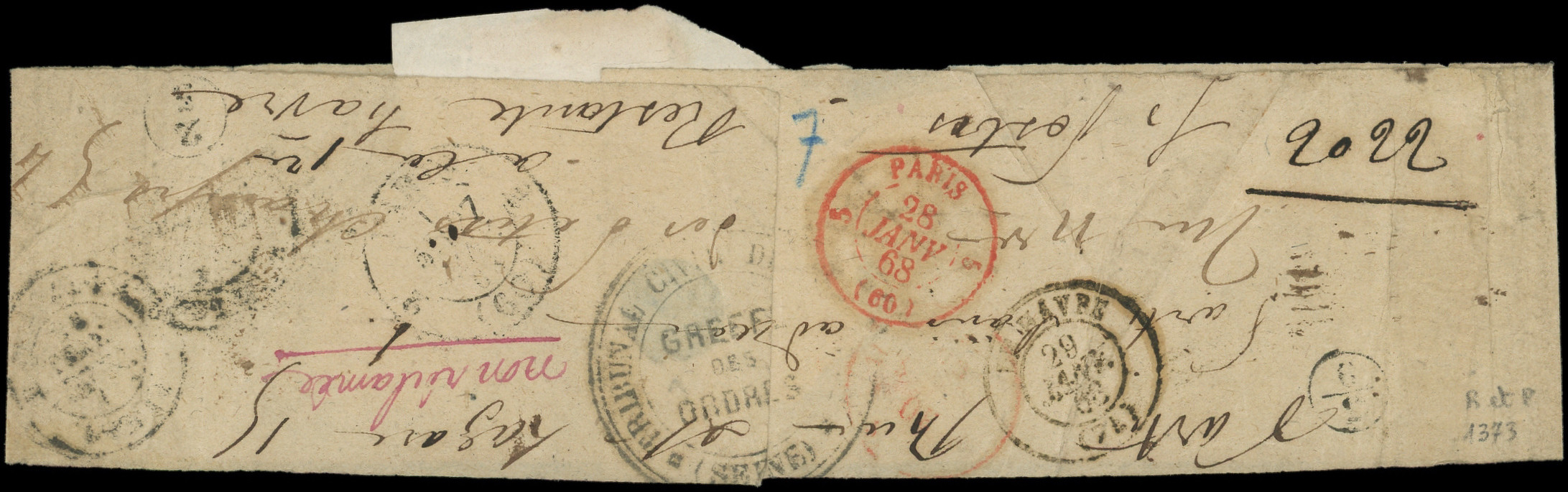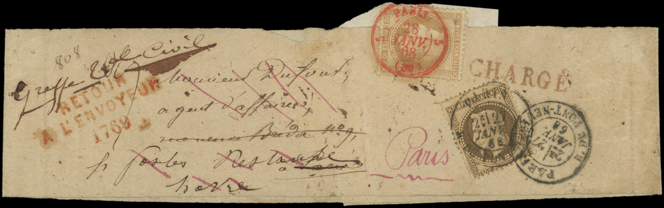 obl. càd R. du Pont Neuf 27/1/68 s. bande d'envoi CHARGE avec au verso cachet du Tribunal Civil de la Seine, réexpédiée au HAVRE avec N°28 obl. du càd T1373 (cat. Rochette Pothion) en ROUGE 28/1/68. Oblitération RARISSIME SUR le timbre, arr. 29/1 et